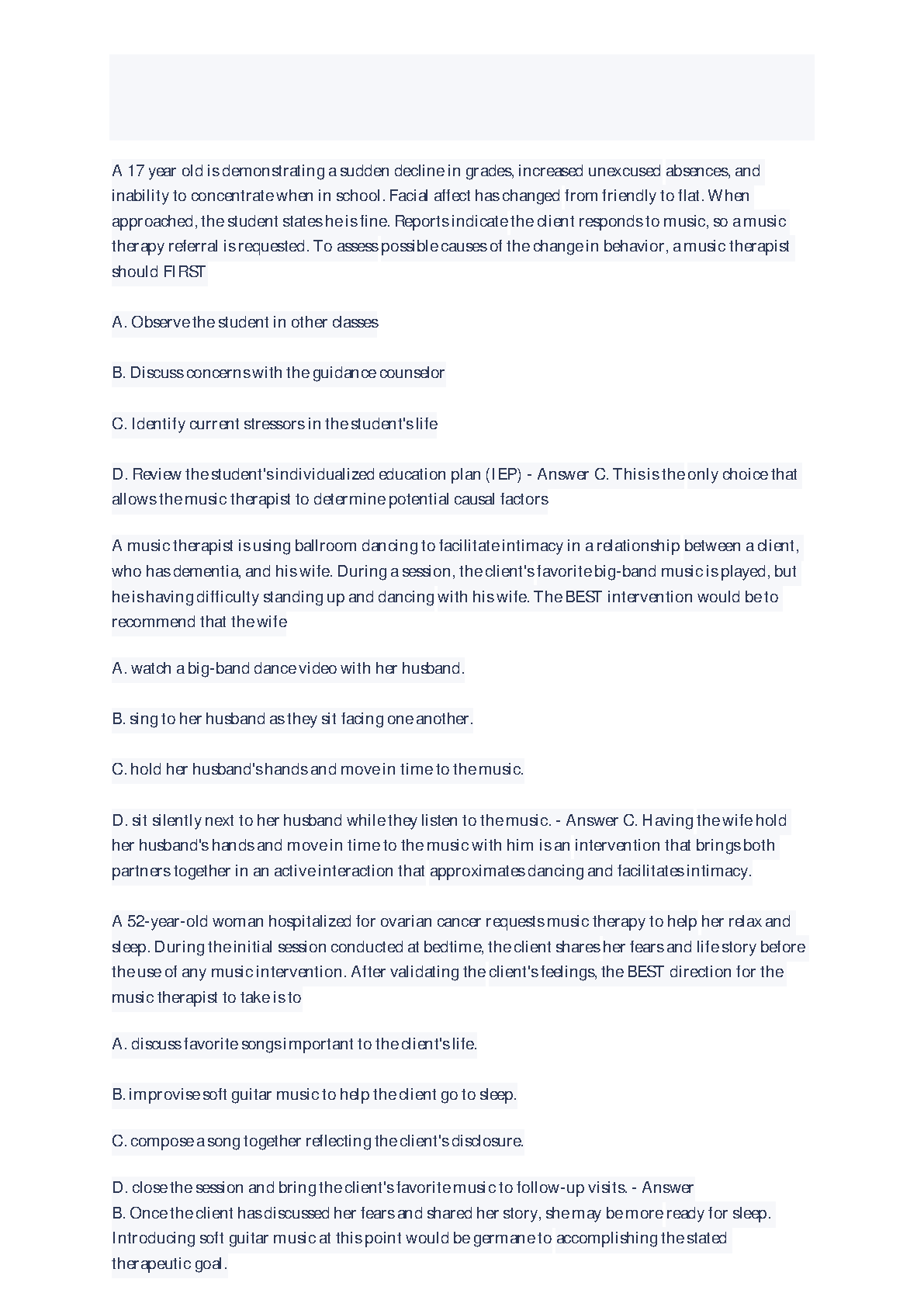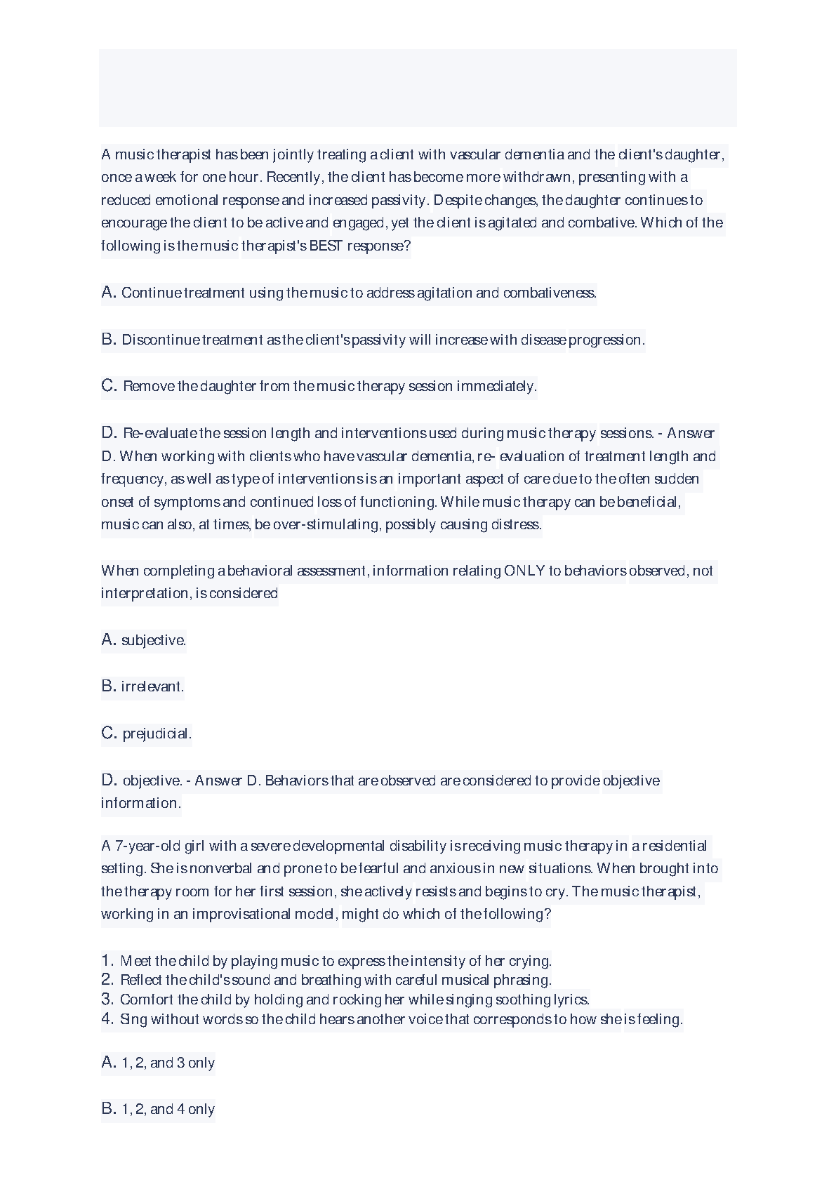CBMT Exam Test Bank: Comprehensive Practice Questions and Answers for Music Therapist Certification