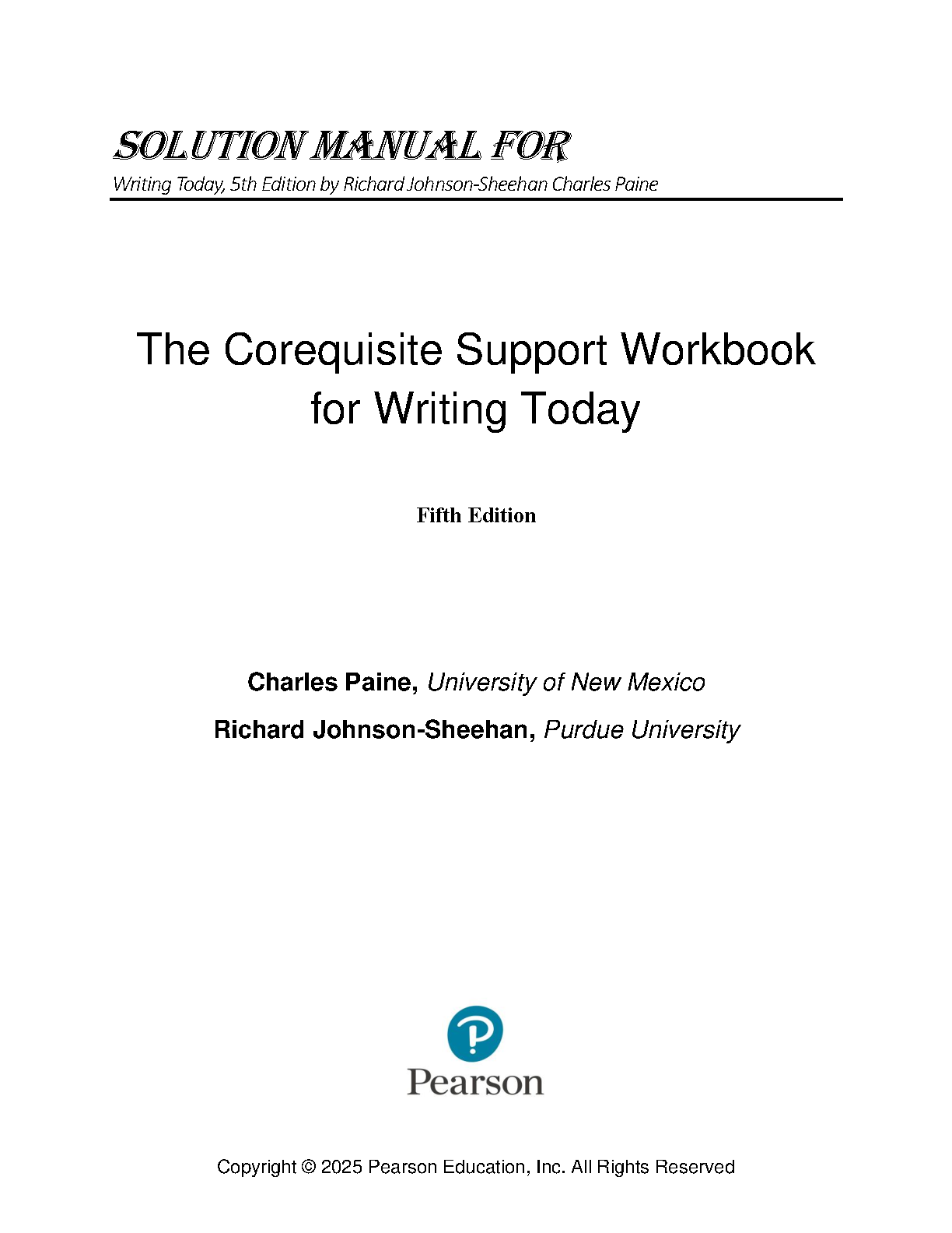Unlock your full potential and master the art of effective communication with the official Solution Manual for 'Writing Today,' 5th Edition. Authored by Richard Johnson-Sheehan and Charles Paine, this guide provides comprehensive, step-by-step solutions and detailed explanations for all exercises. It is the ultimate resource for verifying your answers, preparing for exams with confidence, and deepening your understanding of key writing concepts. Ace your coursework and excel in your studies with this essential academic tool.