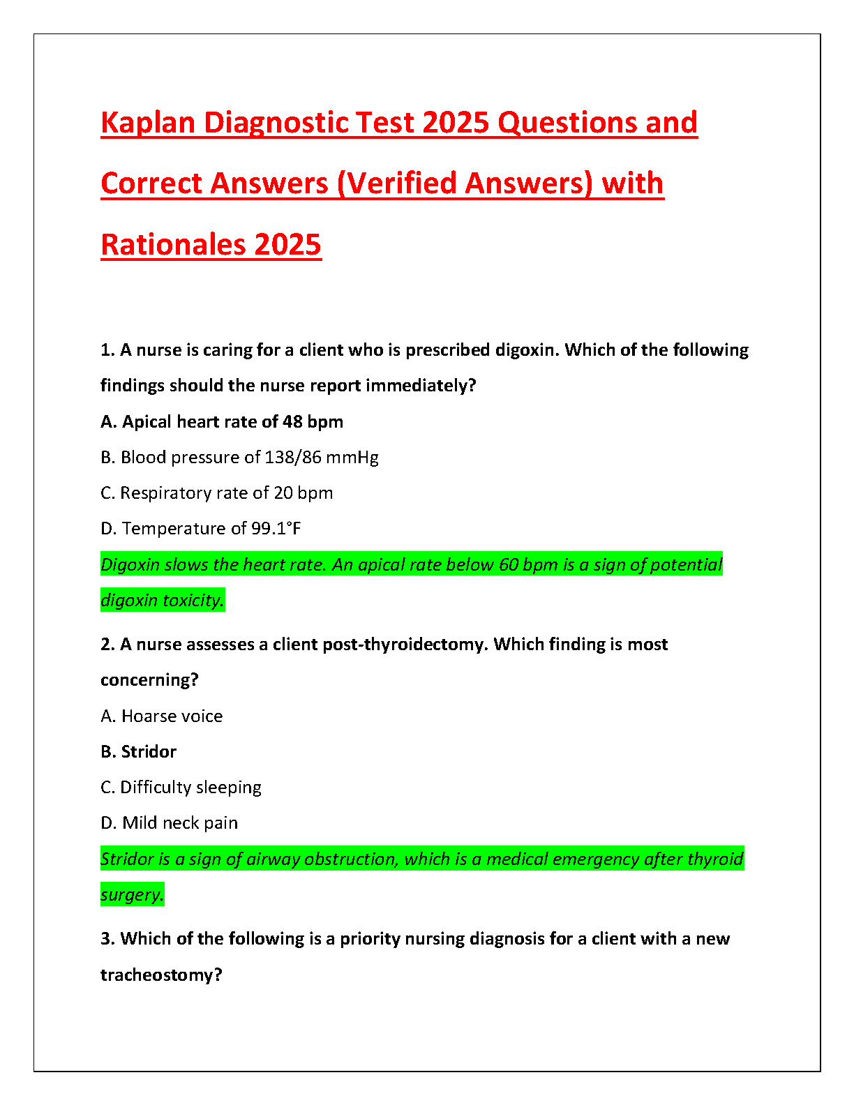 Ace your nursing exams with the ultimate study guide: the Kaplan Diagnostic Test Bank for the 2025 academic year. This comprehensive resource, developed by Kaplan Nursing, is your key to success, featuring a complete collection of questions with 100% correct, verified answers and detailed rationales. Designed to help you master critical concepts and pass your exams on the first attempt, this test bank provides in-depth explanations for each answer, clarifying complex topics and boosting your confidence. Get the latest 2025 edition and take a decisive step towards acing your nursing diagnostic tests and avoiding resits.