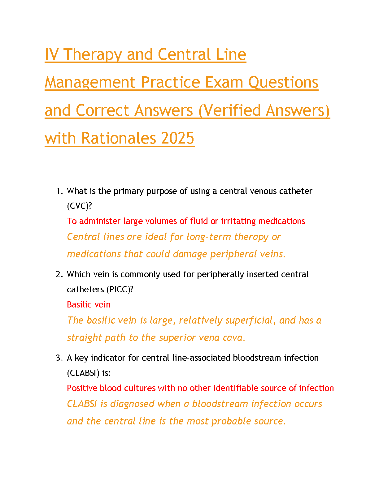 Ace your nursing and medical exams with this comprehensive 2025 Test Bank for IV Therapy and Central Line Management. This essential study guide features a complete set of practice questions, 100% verified correct answers, and detailed rationales to deepen your understanding. Master critical topics such as CVCs, PICC lines, and CLABSI prevention to ensure you pass your exam with confidence on the first try. Instant download for immediate study.
