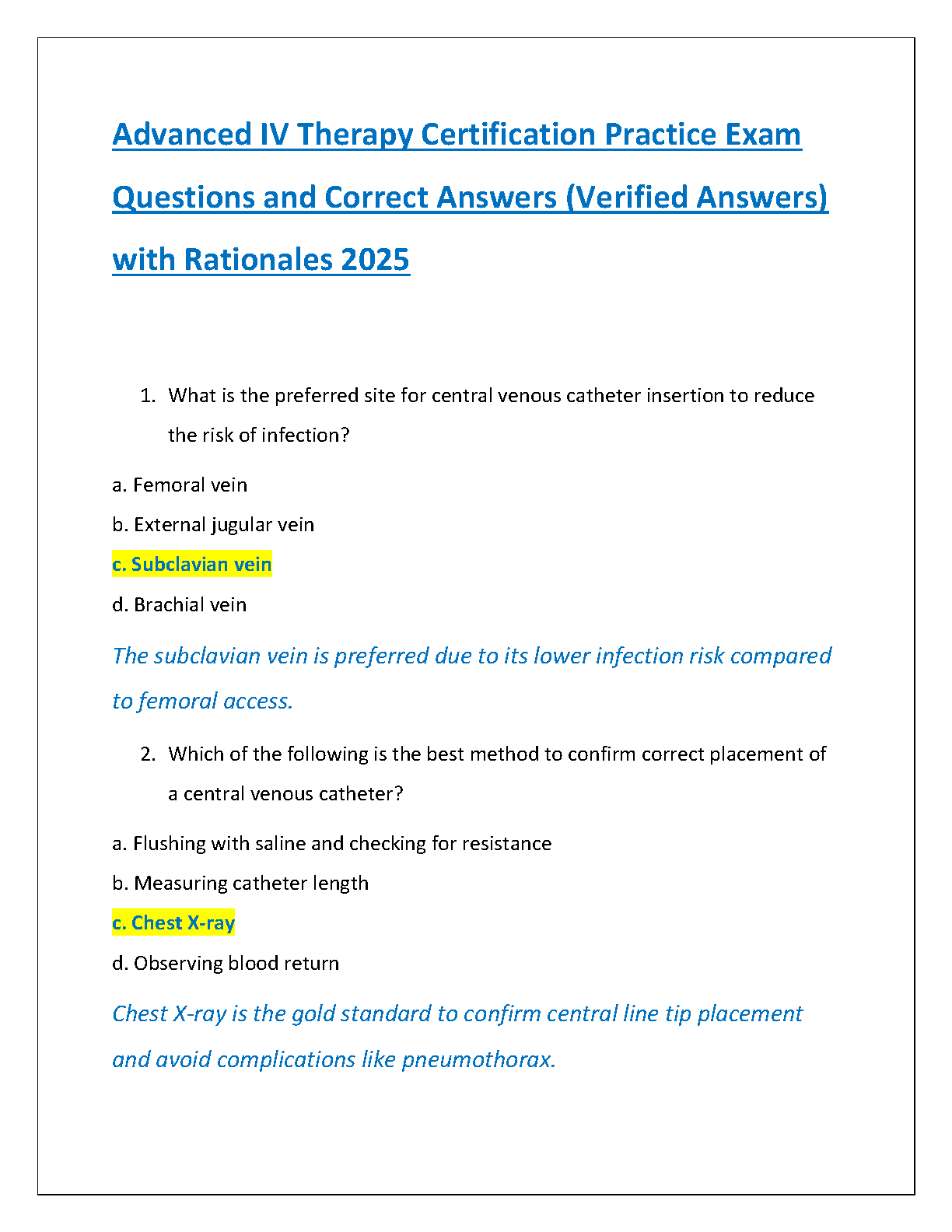 Prepare to excel in your Advanced IV Therapy Certification with this comprehensive 2025 test bank. This essential study resource provides a wide range of practice questions, each accompanied by a verified correct answer and a detailed rationale to deepen your understanding. Covering key topics such as central line placement and infection control, this guide is meticulously crafted to mirror the actual exam format. Master the concepts, build your confidence, and ensure you pass your certification on the very first attempt. Ideal for nurses and healthcare professionals dedicated to advancing their skills.