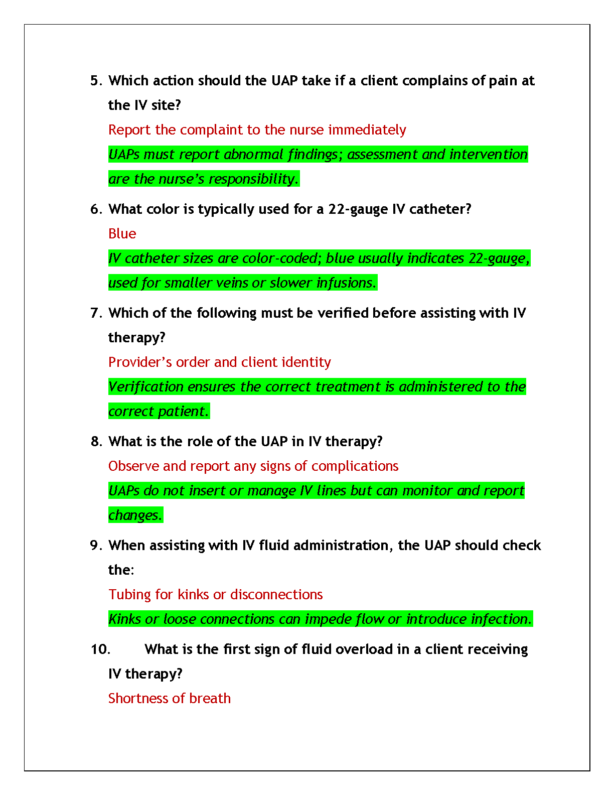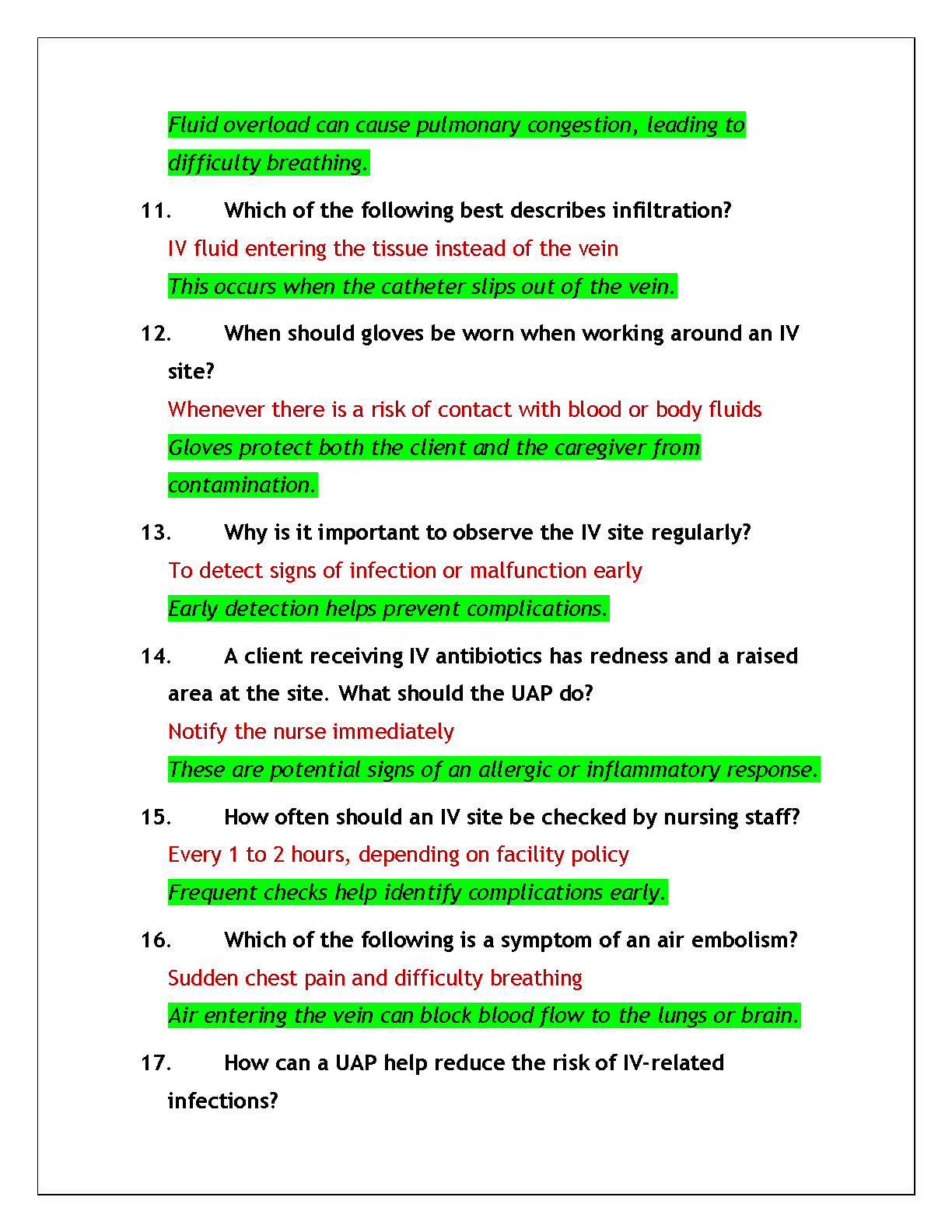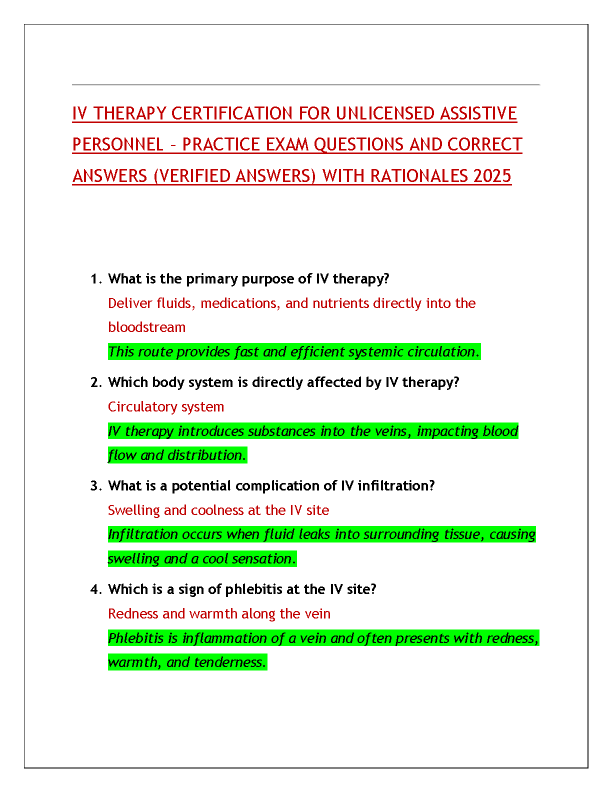 Ace your IV Therapy Certification for Unlicensed Assistive Personnel (UAP) with our newly updated 2025 test bank. This comprehensive study guide is packed with practice exam questions, 100% verified correct answers, and in-depth rationales for each solution. Master key concepts, from the primary purpose of IV therapy to identifying complications like infiltration and phlebitis. This resource is expertly designed to provide you with the knowledge and confidence needed to pass your certification exam on the first attempt. Download now and take the first step towards your career advancement!