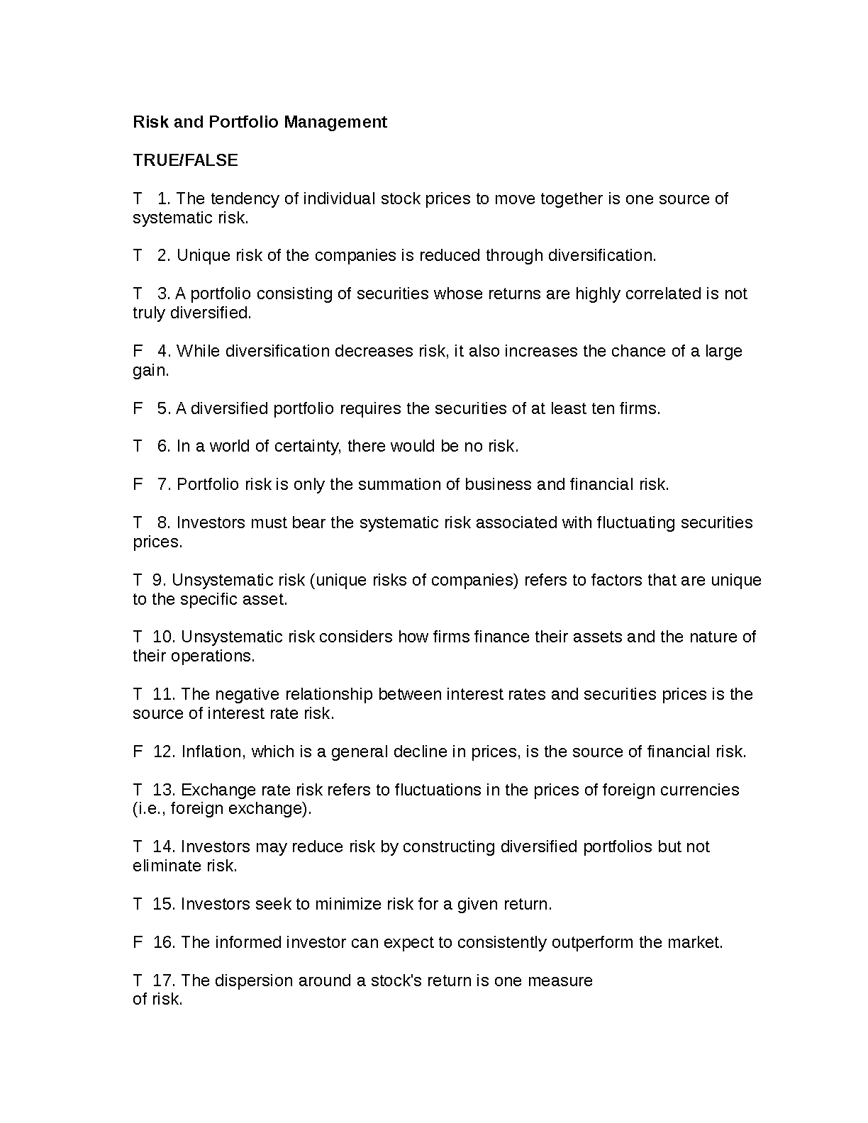 Unlock success in your finance course with this comprehensive test bank covering 'Risk and Portfolio Management,' a key topic from Fundamentals of Corporate Finance, 13th Edition by Ross, Westerfield, and Jordan. This essential study guide features a complete set of True/False questions with verified answers, designed to deepen your understanding of core concepts like systematic and unsystematic risk, diversification strategies, and the principles of modern portfolio theory. Prepare effectively for your exams, master challenging topics, and boost your grades with this instant-download resource.