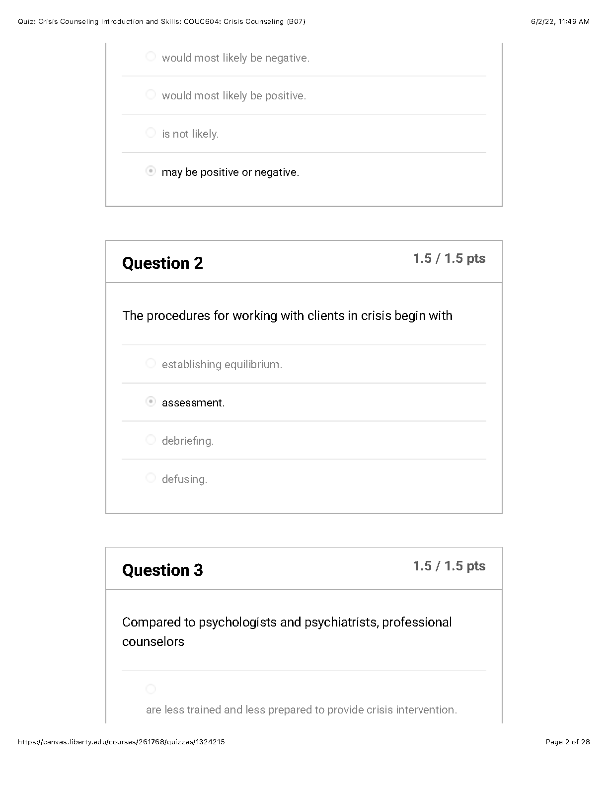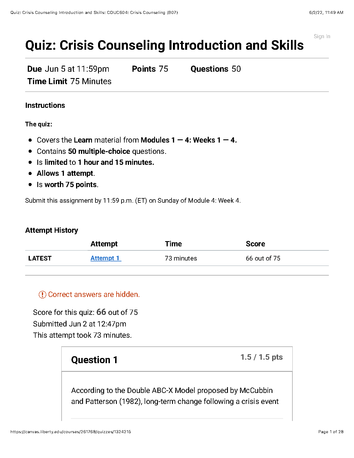 Prepare for success in your Liberty University course with this detailed test bank for the COUC604: Crisis Counseling Introduction and Skills quiz. This guide features 50 multiple-choice questions covering key concepts from Modules 1 through 4. Aligned with 'Crisis Intervention Strategies, 9th Edition' by James and Gilliland, this resource will help you master the material, including theories like the Double ABC-X Model, and achieve top scores on your exam. Download now to study effectively and confidently.