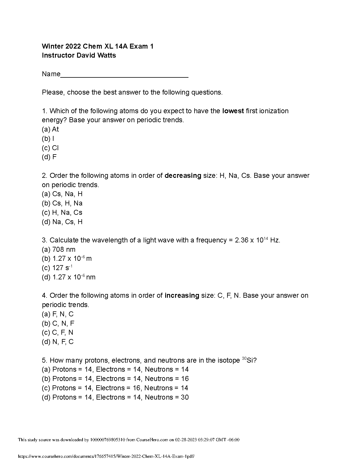 Unlock success in your General Chemistry course with this authentic Exam 1 from UCLA's Chem XL 14A, taught by Instructor David Watts during the Winter 2022 term. This comprehensive test bank provides the actual questions students faced, covering critical topics such as periodic trends (ionization energy and atomic size), calculating the wavelength of light, and determining the number of protons, electrons, and neutrons in isotopes. Updated and curated for the 2025/2026 academic year, this study resource is expertly designed to help you understand the exam format, master key concepts, and pass your exam on the very first try. Stop worrying about resits and start studying with a proven tool for success.
