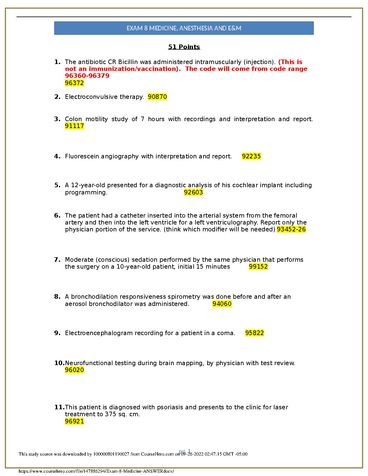 Medical Coding Test Bank: Exam 8 (Medicine, Anesthesia, E&M) with 100% Correct CPT Code Answers | 2025/2026 Study Guide