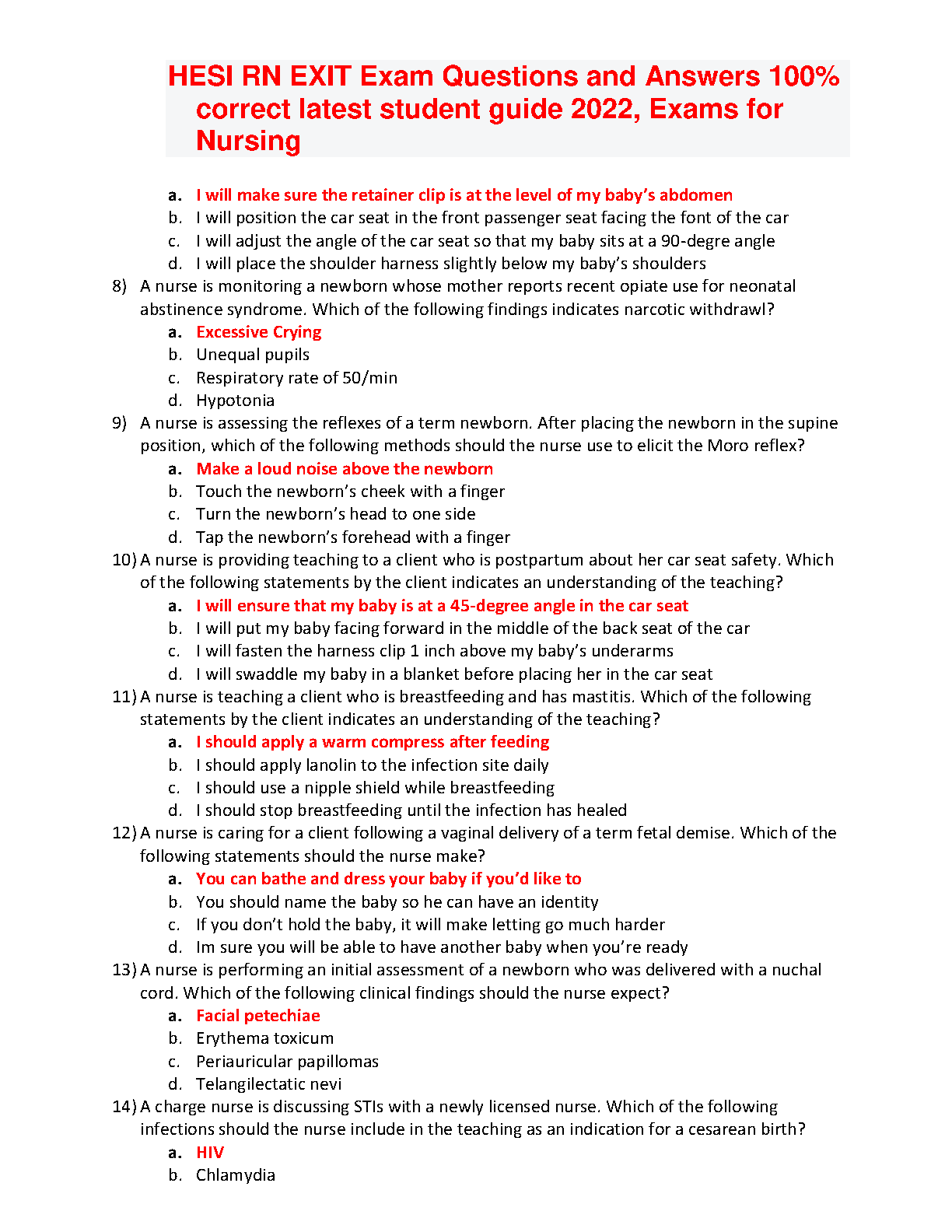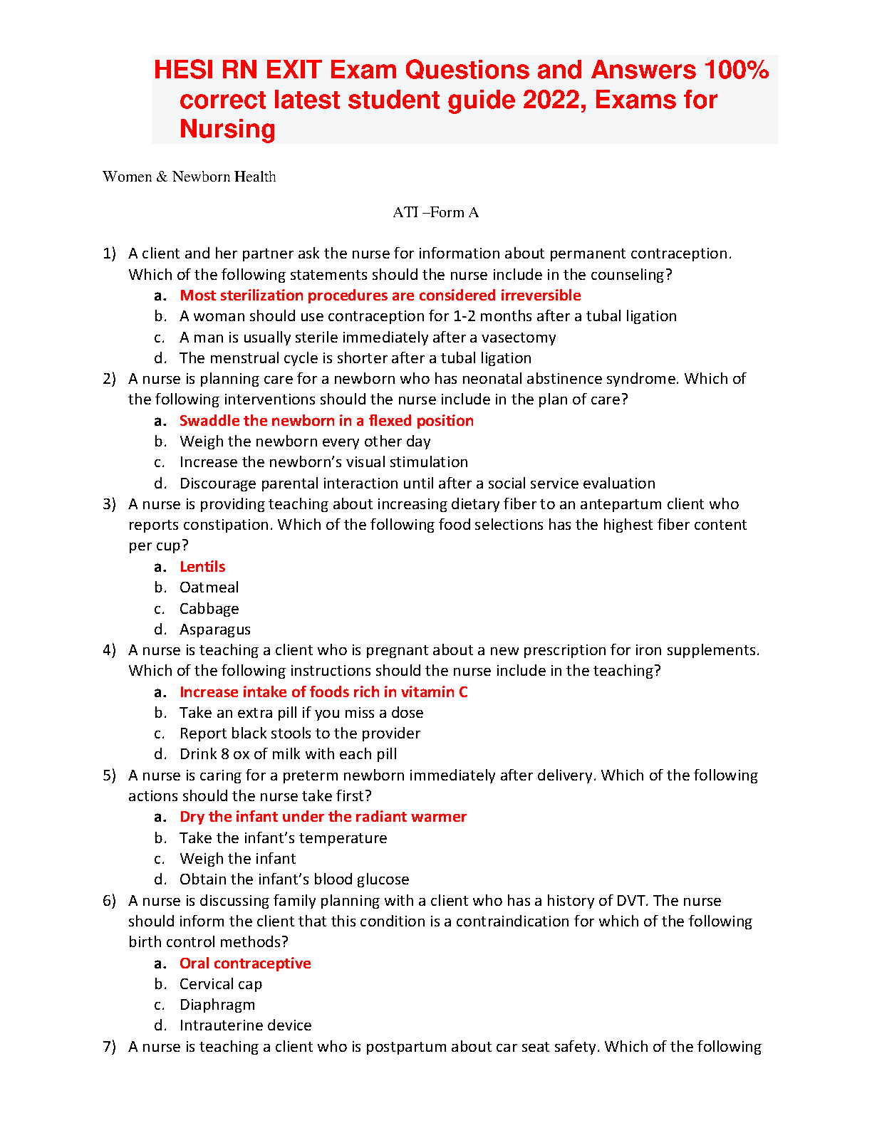 Ace your HESI RN EXIT Exam with our comprehensive 2025/2026 study guide focused on Women & Newborn Health. This essential resource features a curated bank of exam-style questions complete with 100% correct and verified answers. Master critical topics such as permanent contraception, neonatal abstinence syndrome, antepartum care, iron supplementation, preterm infant care, and postpartum safety. Designed to mirror the actual exam format, this guide is your key to building confidence, avoiding resits, and passing on your first attempt. Download now to start your focused preparation!