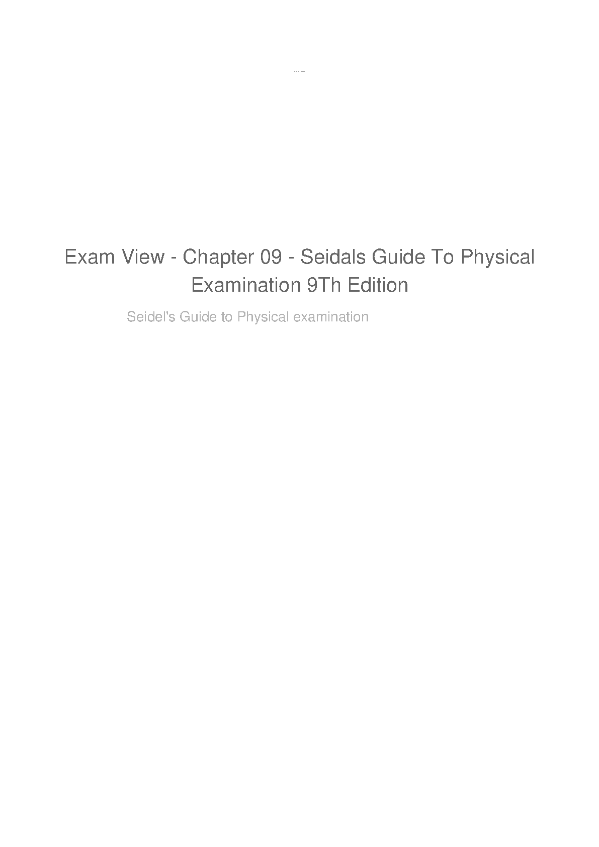Unlock academic success with the complete Test Bank for Chapter 9 of Seidel's Guide to Physical Examination, 9th Edition. Authored by Jane W. Ball, Joyce E. Dains, John A. Flynn, Barry S. Solomon, and Rosalyn W. Stewart, this resource provides an extensive collection of exam-style questions and verified answers. Designed to sharpen your critical thinking and deepen your understanding, this study aid is essential for nursing students aiming to ace their physical assessment courses and pass exams with confidence. Download now to start preparing effectively.