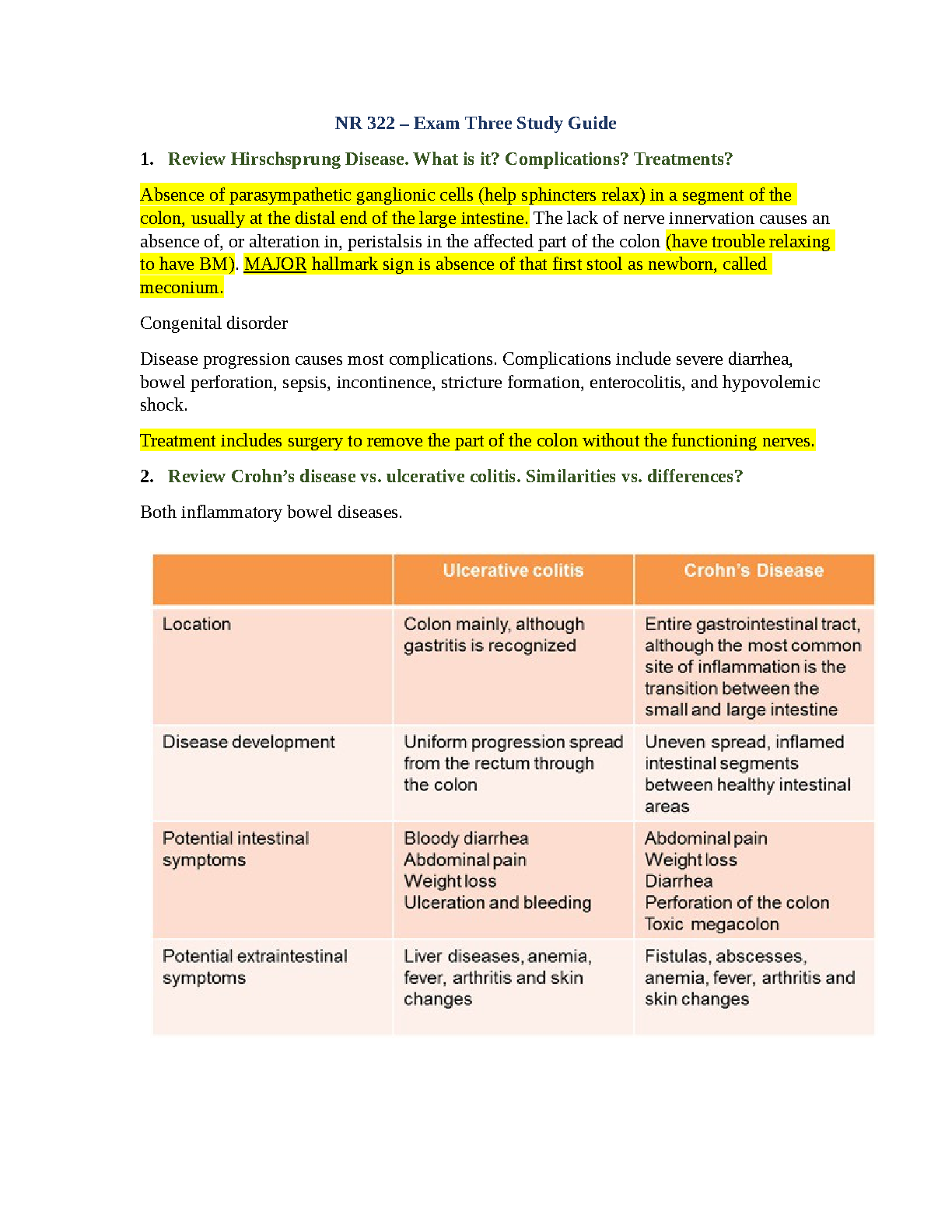 Ace your NR 322 Exam 3 with this comprehensive 2025/2026 study guide. This resource provides a detailed breakdown of crucial topics, ensuring you pass on your first try. It covers an in-depth review of Hirschsprung Disease, from its congenital origins and hallmark sign of absent meconium to its complications and surgical treatments. Additionally, it features a clear, side-by-side comparison of Ulcerative Colitis and Crohn's Disease, clarifying the distinctions in location, disease development, and both intestinal and extraintestinal symptoms. Master these complex gastrointestinal disorders and walk into your exam with confidence.