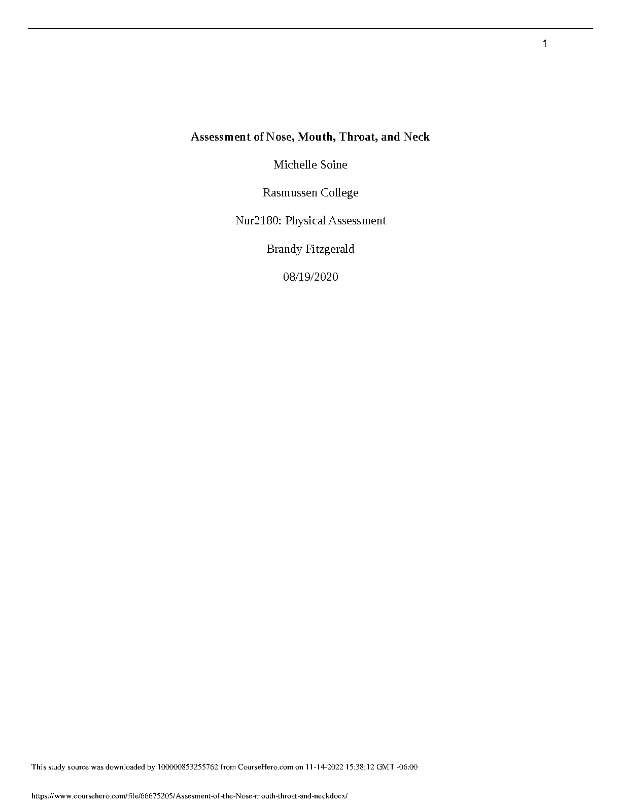 Rasmussen College Nur2180 Physical Assessment Case Study: Nose, Mouth, Throat, and Neck | Updated 2025-2026 Exam Prep to Pass on First Try