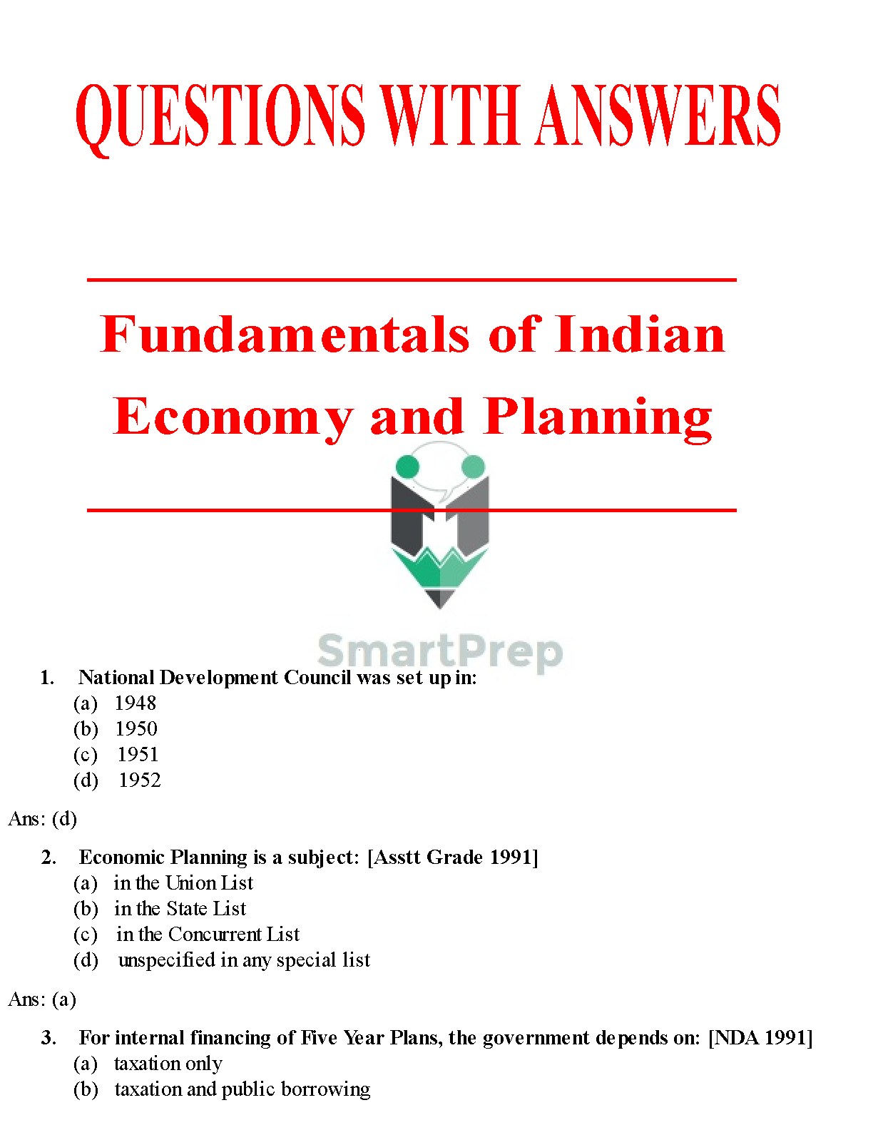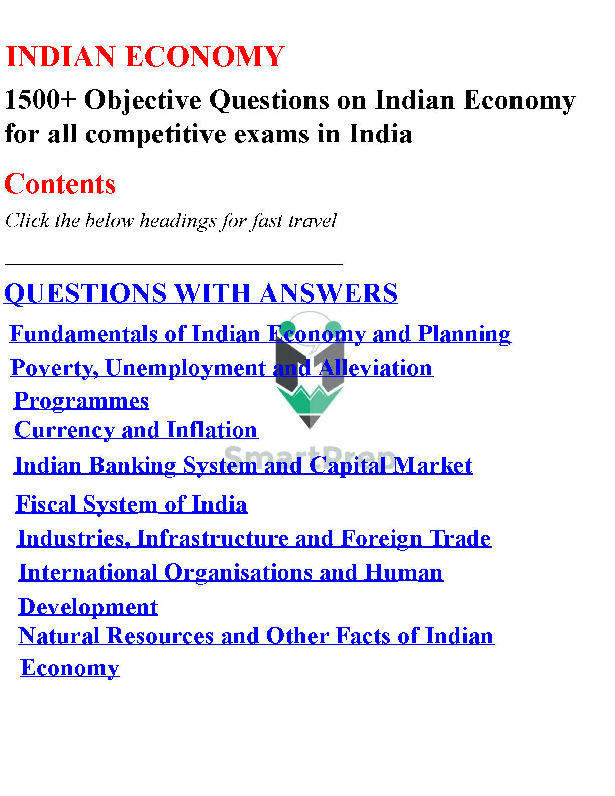 Test Bank for Indian Economy: Objective Pattern for Competitive Exams, 1st Edition by SmartPrep