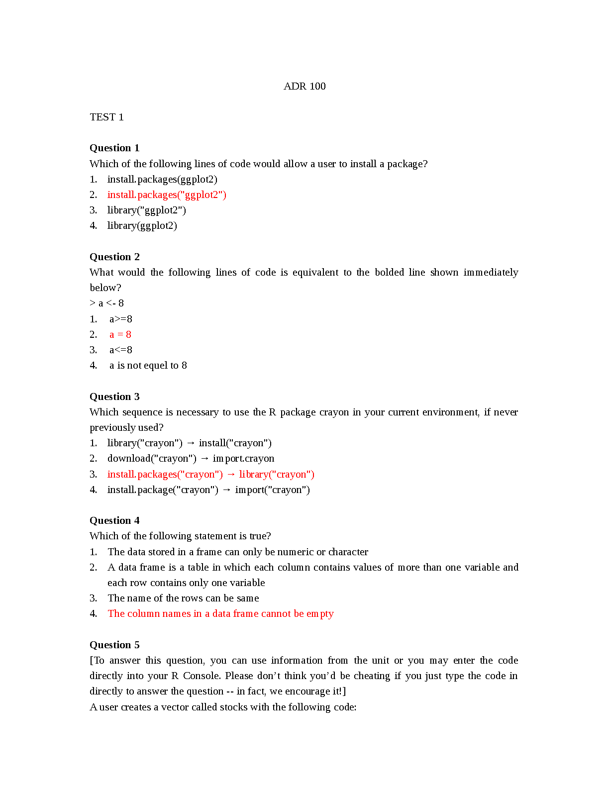 ADR 100 Introduction to R Programming - Complete Test Bank with Questions & Verified Solutions