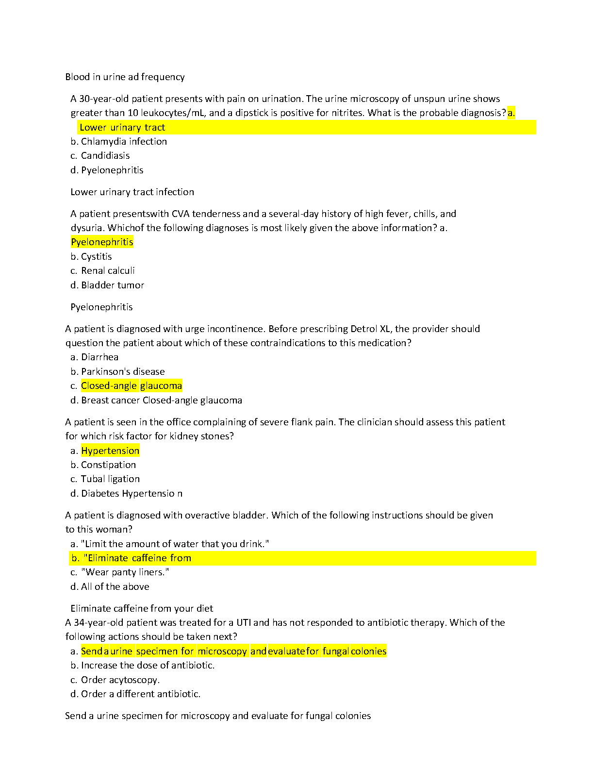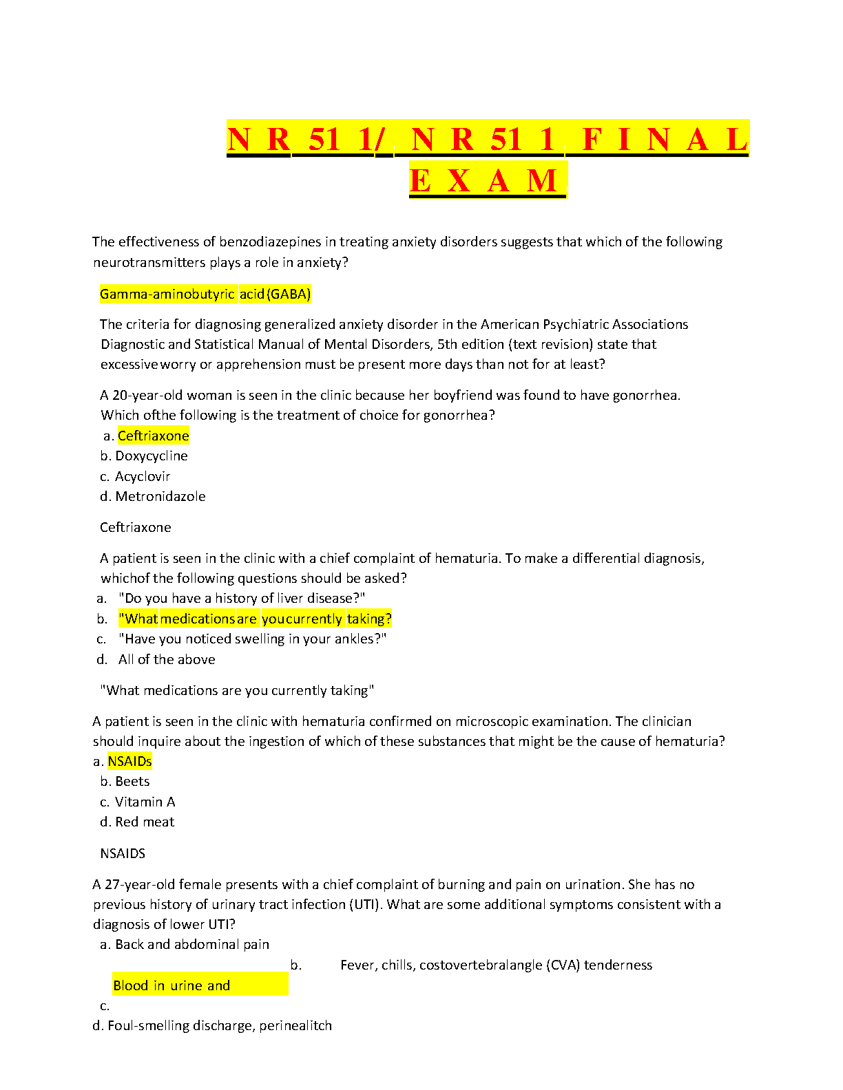 Unlock success in your NR 511 course with this complete and verified Test Bank for the Final Exam. This essential study resource provides a wide range of practice questions and detailed answers, covering key nursing topics such as anxiety disorders, UTIs, gonorrhea, differential diagnosis for hematuria, and pharmacological treatments. Designed to help you master the material, build confidence, and pass your final exam on the first attempt.