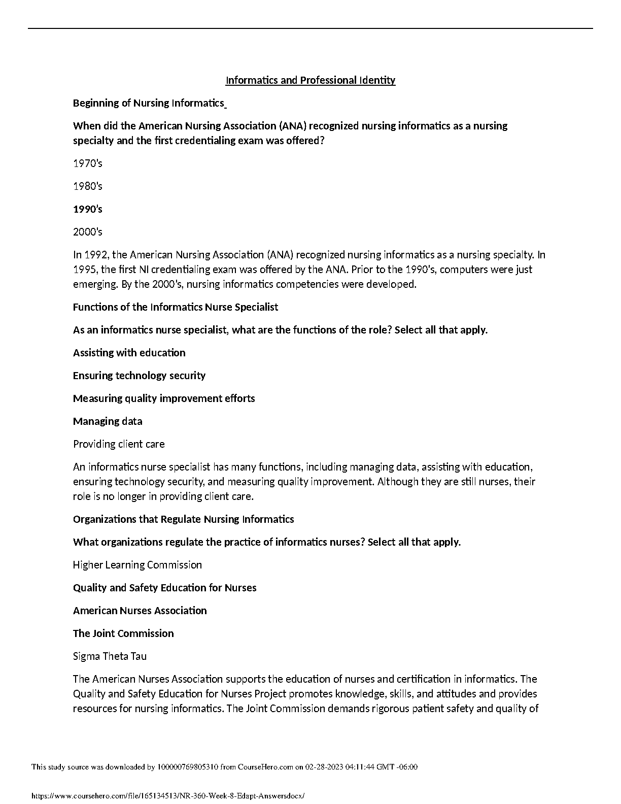 NR 360 Week 8 Edapt Test Bank: Informatics & Professional Identity | McGonigle & Mastrian, 5th Edition