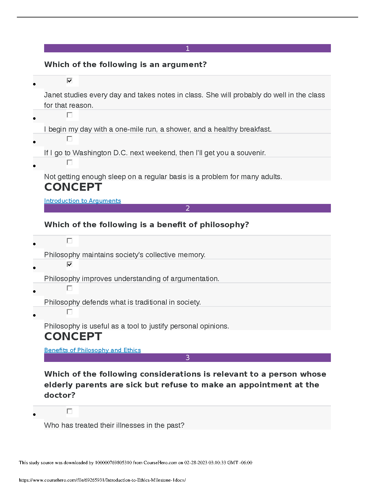Ace your Sophia Learning 'Introduction to Ethics' course with our comprehensive Milestone 1 Test Bank for the 2025-2026 academic year. This guide provides a complete set of questions and verified correct answers, covering key concepts such as the fundamentals of arguments, the benefits of philosophy and ethics, and complex ethical considerations. Our study material is expertly designed to help you understand the core topics and confidently pass your Milestone 1 exam on your first try, avoiding any need for resits. Get the edge you need to succeed in your ethics studies today!