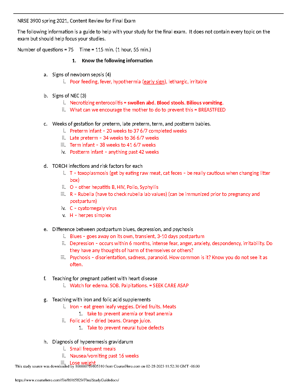Master your NRSE 3900 final exam with this comprehensive study guide, updated for the 2025/2026 academic year. This detailed elaboration provides a focused review of all essential topics to ensure you pass on your first try. Key areas covered include: signs of newborn sepsis and necrotizing enterocolitis (NEC), TORCH infections and risk factors, distinguishing between postpartum blues, depression, and psychosis, patient teaching for heart disease, and management of hyperemesis gravidarum. Ace your exam with this essential resource designed for success.