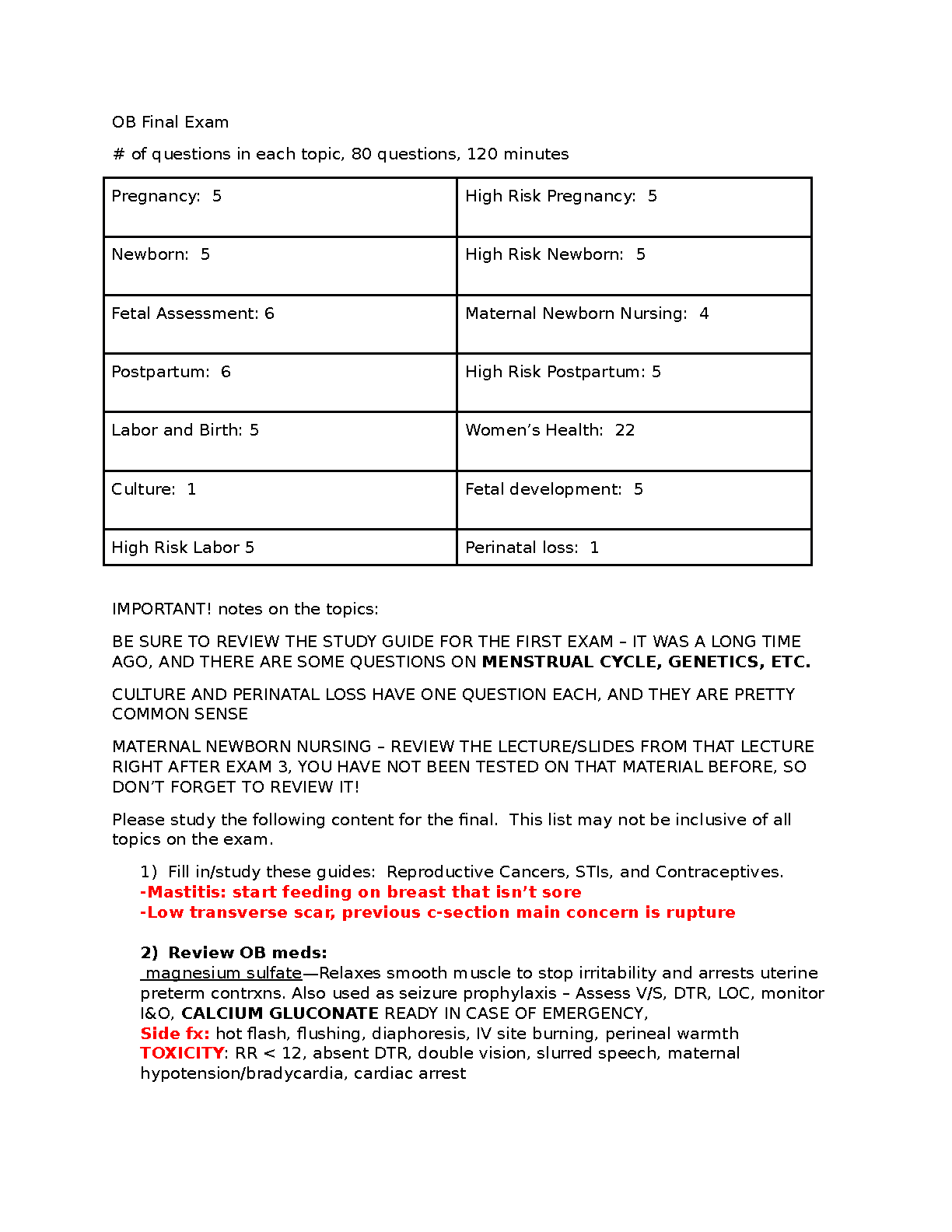 Ace your upcoming OB Final Exam with our latest 2025/2026 study guide! This comprehensive exam elaboration provides a detailed breakdown of all the essential topics you need to master, ensuring you can pass on your very first try. The guide covers 80 questions across key areas including Pregnancy, Postpartum, Newborn Care, Labor & Birth, Women's Health, and High-Risk situations. It features crucial, high-yield notes on must-know topics like OB medications (e.g., Magnesium Sulfate and its antidote), management of mastitis, post c-section care, STIs, and a review of foundational concepts like the menstrual cycle and genetics. Stop worrying about resits and start studying smart with this targeted review designed for success.