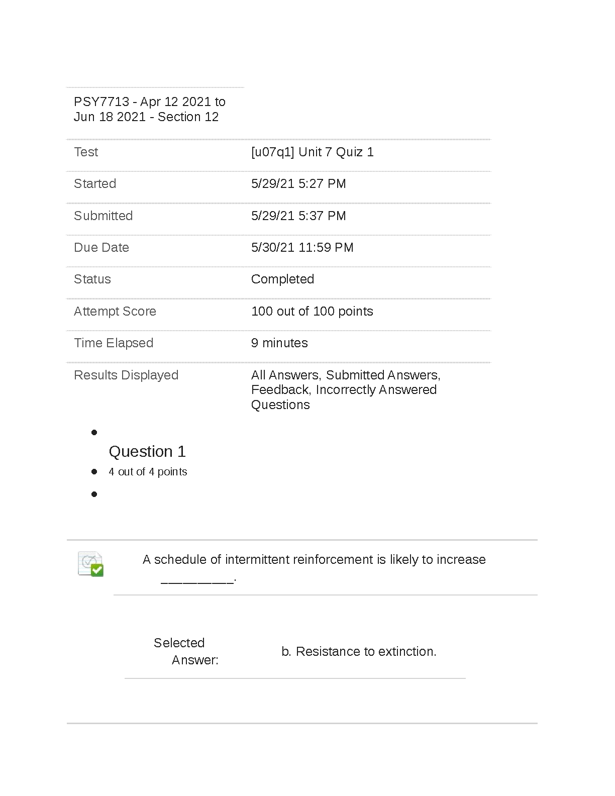 Unlock success in your PSY7713 - Applied Behavior Analysis course with our detailed exam elaboration for the Unit 7 Quiz 1. This essential study guide features the complete set of questions along with 100% accurate and verified answers, taken directly from a top-scoring test. Instantly download this resource to master complex topics like intermittent reinforcement, prepare effectively for your assessments, and aim for the highest grade. Ideal for students seeking to excel and pass with confidence.