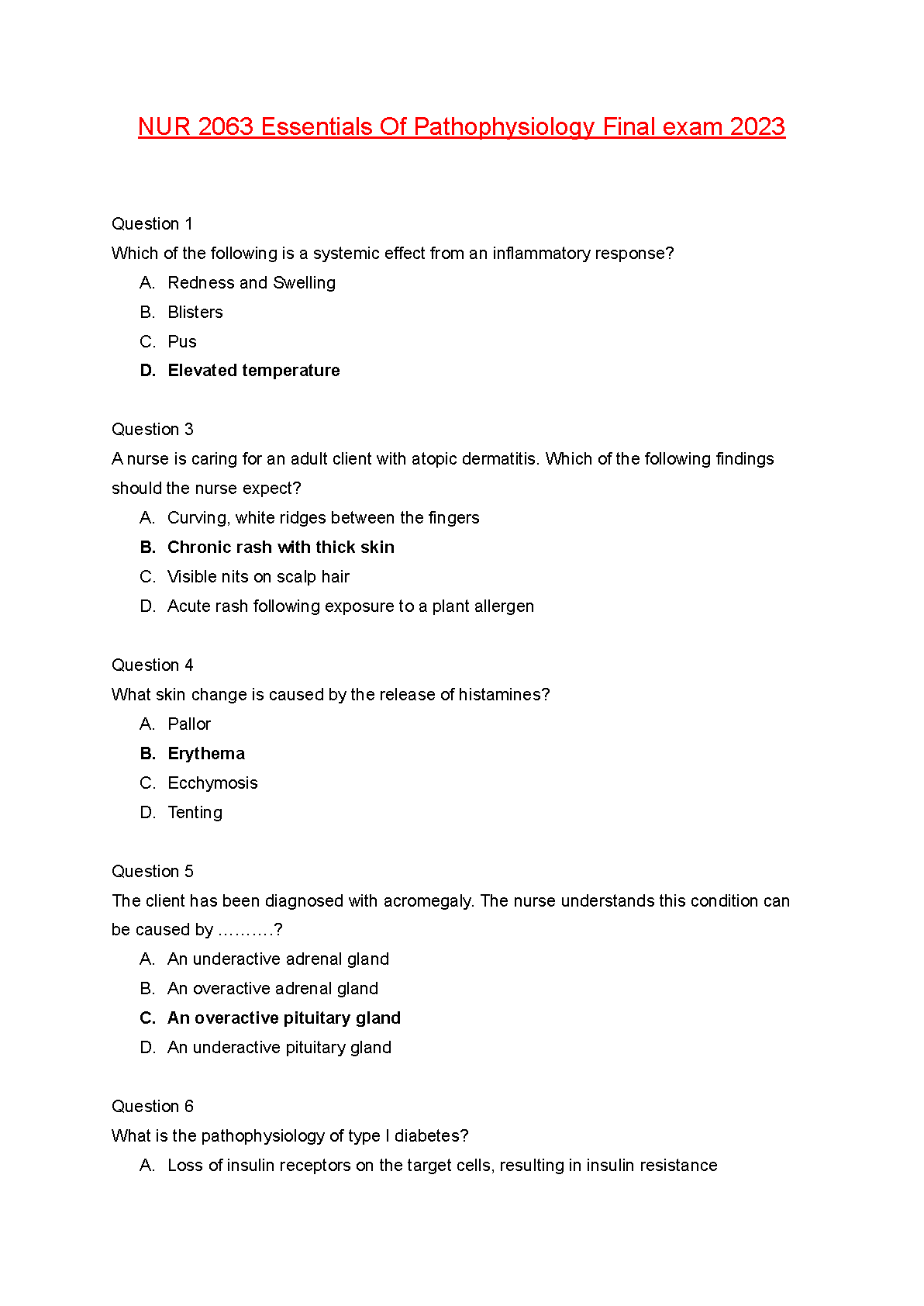 Excel in your NUR 2063 Essentials of Pathophysiology course with our latest 2025/2026 Test Bank for the final exam. This comprehensive resource is expertly designed to help you master complex pathophysiological concepts and pass your exam on the first try. Inside, you'll find a wide range of multiple-choice questions, complete with verified answers, covering critical topics such as inflammatory responses, endocrine system disorders, atopic dermatitis, and cellular mechanisms. Aligned with major textbooks like Porth's, this study guide provides the practice and confidence you need to avoid resits and achieve top grades. Download now for instant access and start preparing for success!