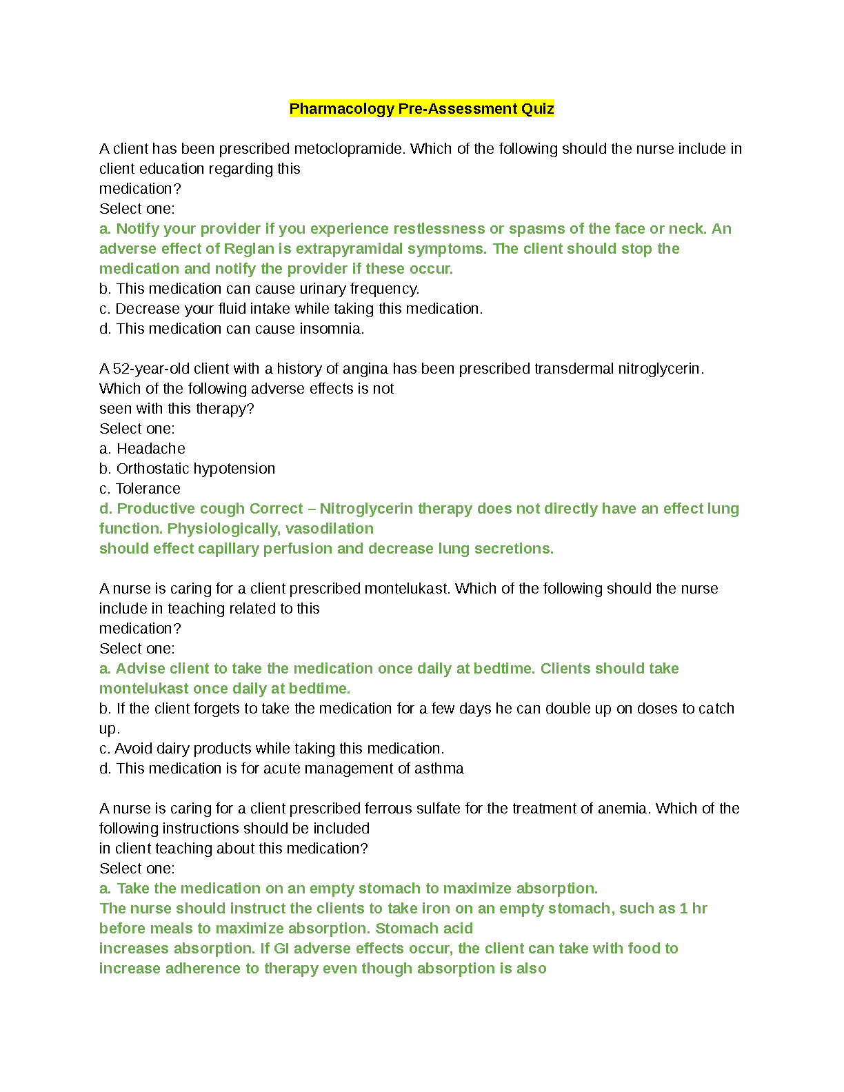Master the core concepts of pharmacology with our comprehensive Pre-Assessment Quiz Test Bank. This essential study guide features a wide range of multiple-choice questions covering key medications like metoclopramide, nitroglycerin, montelukast, and more. Each question is paired with a verified correct answer and a detailed, easy-to-understand rationale, explaining the 'why' behind the answer. Perfect for nursing students and aspiring healthcare professionals, this resource is expertly designed to help you identify your strengths and weaknesses, solidify your knowledge, and build confidence for your exams. Ace your pharmacology assessments on the first try with these practice questions.