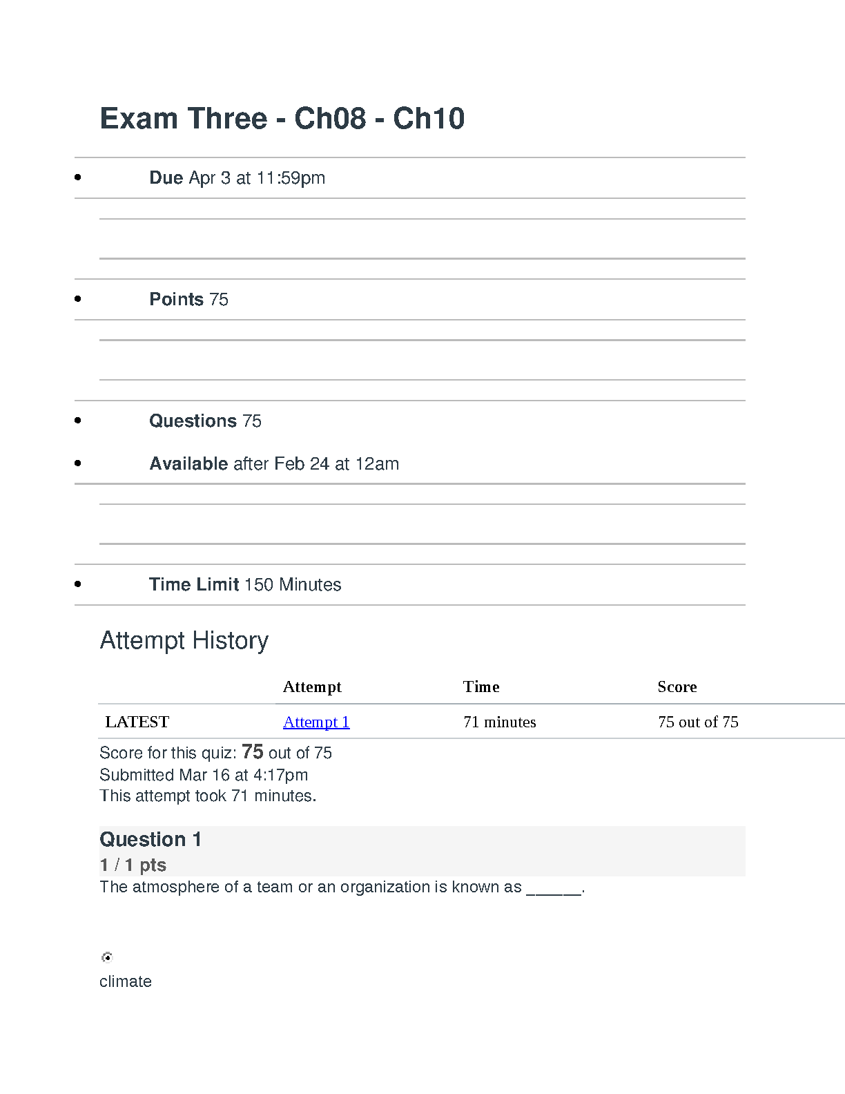 Ace your third exam with this comprehensive test bank for Chapters 8, 9, and 10 of 'Organizational Behavior,' 18th Edition by Stephen P. Robbins and Timothy A. Judge. This resource features 75 exam-style questions complete with verified answers, as demonstrated by the 100% score in the preview. Master key concepts from these crucial chapters and prepare effectively to achieve top grades in your course.