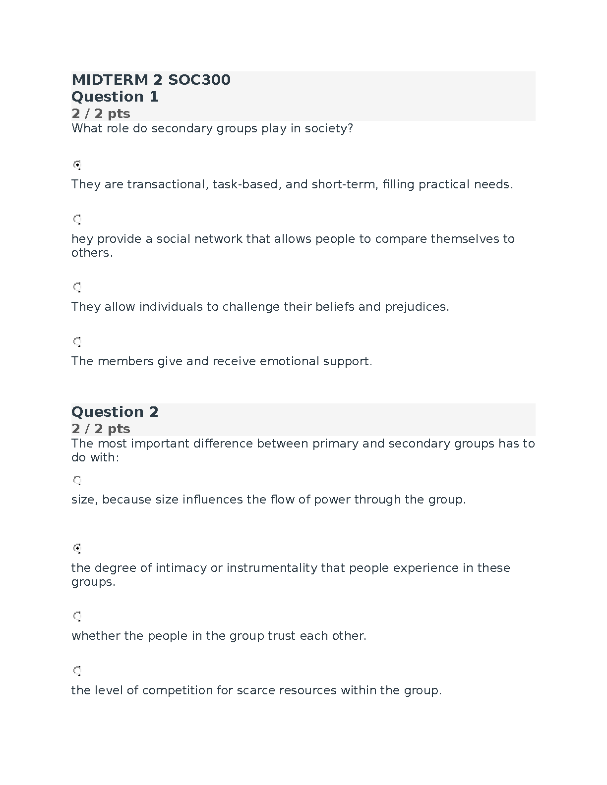Prepare to excel in your SOC300 Midterm 2 exam with this comprehensive test bank. This resource features a collection of actual exam questions, complete with verified answers, focusing on core sociological concepts like the function and dynamics of primary and secondary groups. Gain the confidence you need by practicing with real test material, ensuring you understand the key topics and are ready to achieve a top grade. Ideal for students aiming to solidify their knowledge and pass their sociology midterm with flying colors.