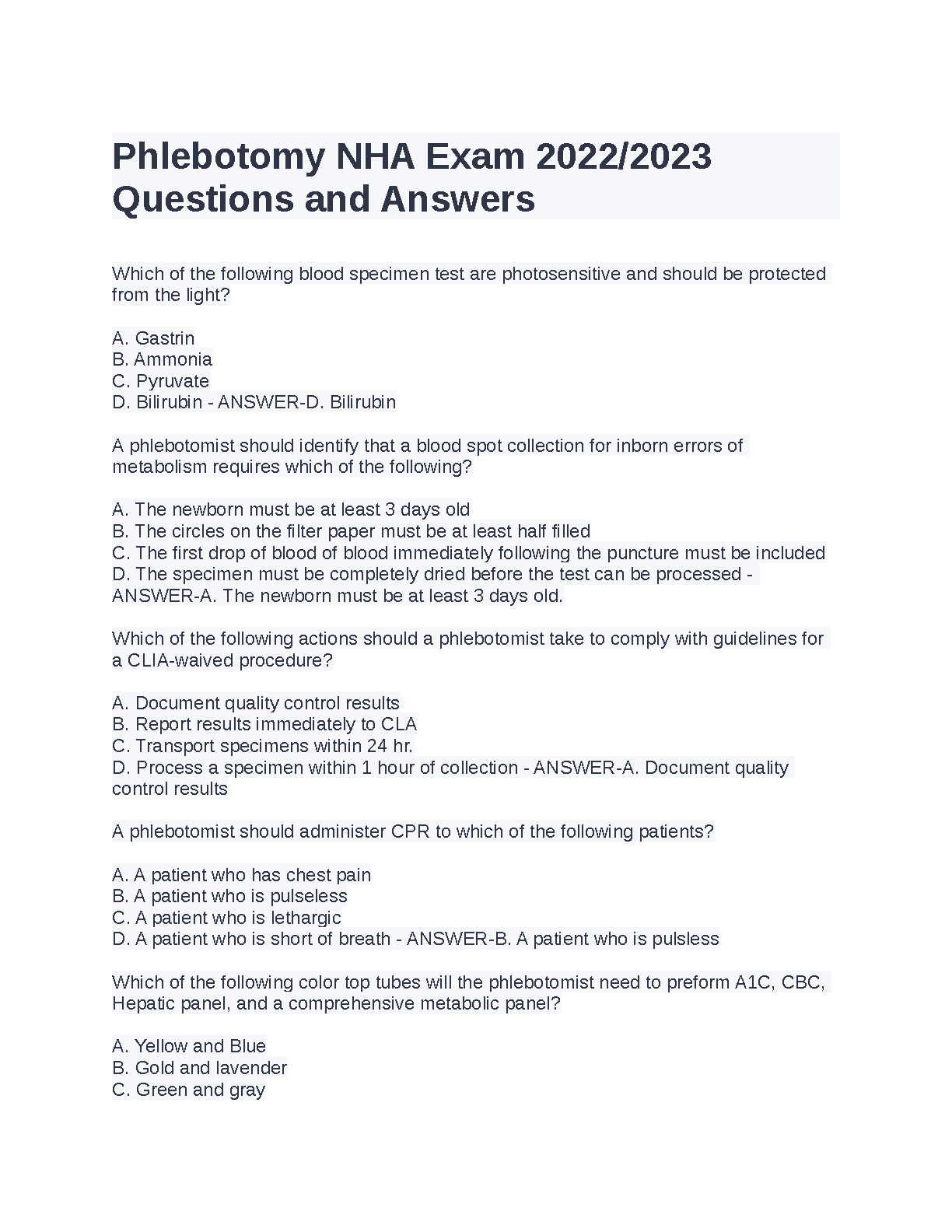 Ace your National Healthcareer Association (NHA) Phlebotomy Technician (CPT) certification exam on your very first attempt with our latest 2025/2026 Test Bank. This comprehensive resource is packed with a wide range of practice questions and detailed, verified answers that mirror the actual exam format. Covering crucial topics such as specimen collection and handling, patient safety, laboratory procedures, and quality control, this study guide is meticulously designed to build your confidence and ensure you master the material. Stop worrying about resits and start your career as a certified phlebotomy technician. Download now for immediate access and guarantee your success!