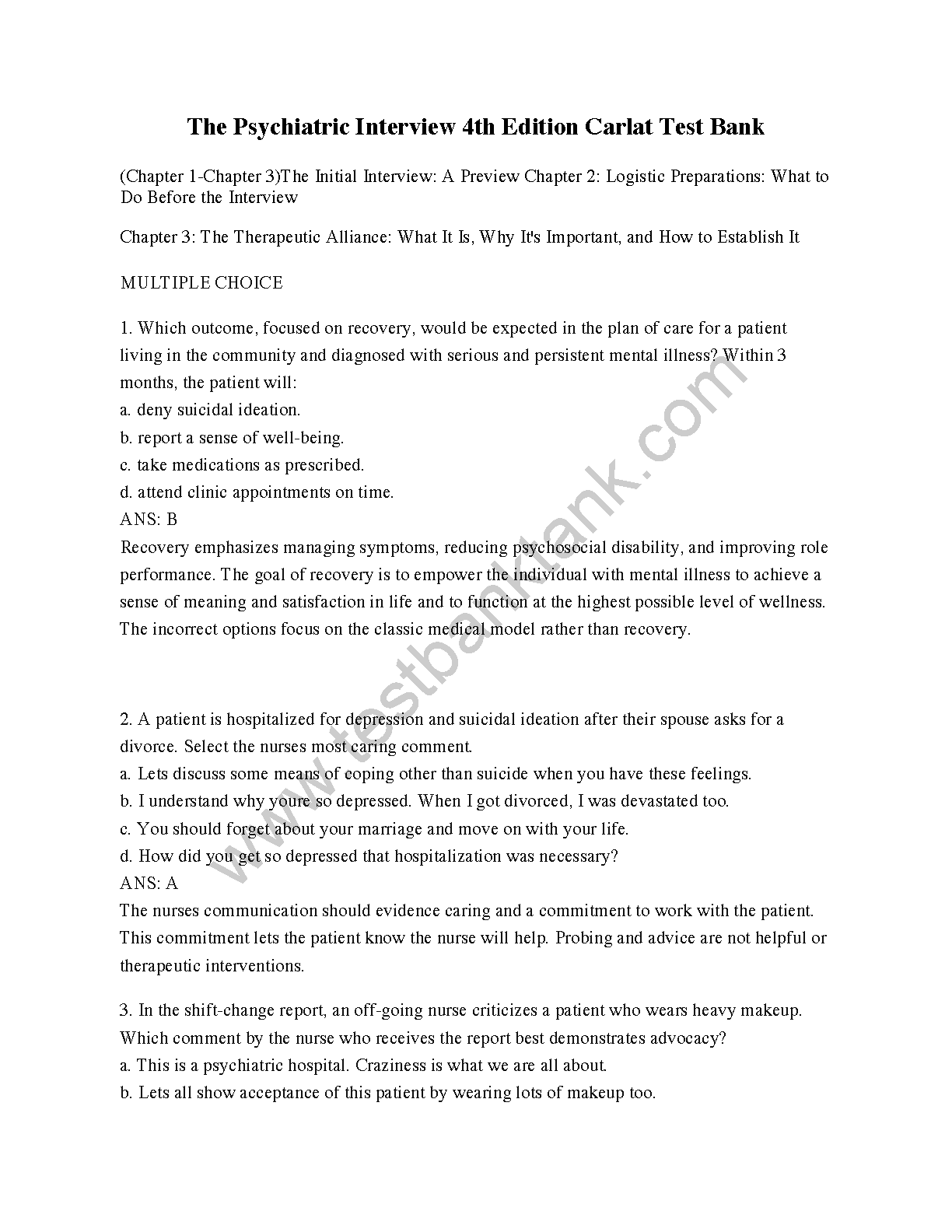 Unlock your full potential in psychiatric nursing and mental health studies with the official Test Bank for 'The Psychiatric Interview, 4th Edition' by Daniel J. Carlat. This comprehensive resource provides a complete collection of multiple-choice questions, complete with answers and detailed rationales, covering key initial chapters. Dive deep into essential topics such as conducting the initial interview, logistical preparations, and building a strong therapeutic alliance. This test bank is the ultimate tool to reinforce your learning, test your knowledge, and prepare effectively for your exams. Get instant access and start studying smarter today!