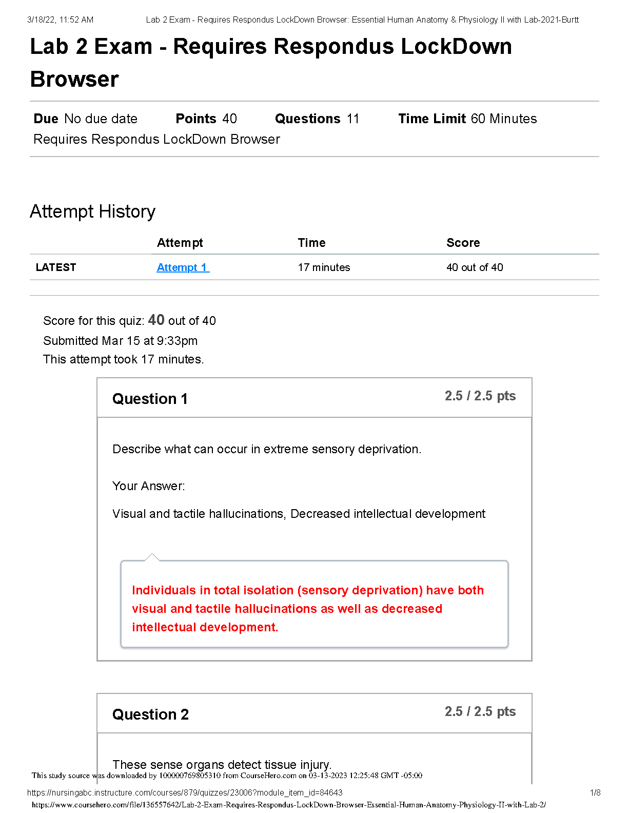 Unlock exam success with our comprehensive study guide for the Lab 2 Exam in Essential Human Anatomy & Physiology II, based on the 13th Edition by Marieb & Keller. This guide features all exam questions with 100% correct, verified answers, just like the one that scored a perfect 40/40. Master key concepts, from sensory deprivation to tissue injury detection, and walk into your exam with confidence. This is the ultimate resource for the 2025/2026 academic year to help you ace your A&P II lab exam and pass on your first attempt, avoiding costly resits. Download now and secure your A+ grade!