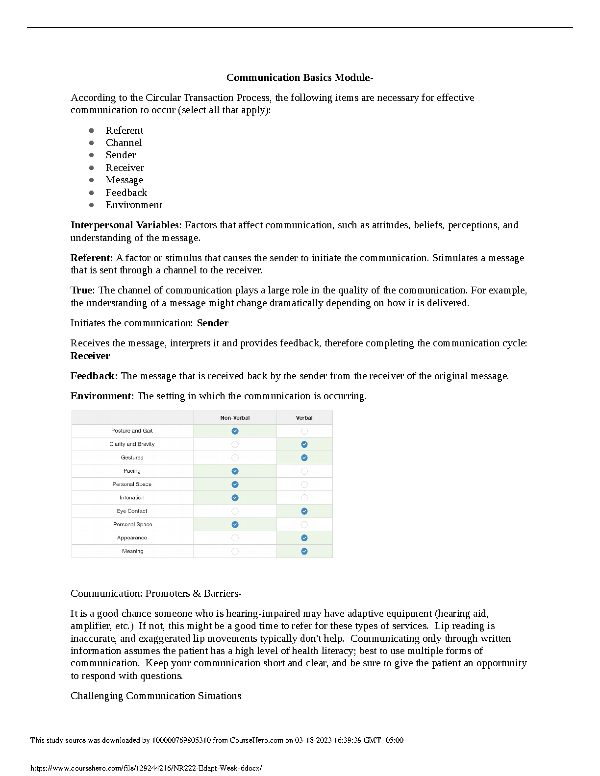 NR 222 Edapt Week 6 Communication Basics Module | Latest 2025/2026 Exam Elaboration Guide to Pass on Your First Attempt