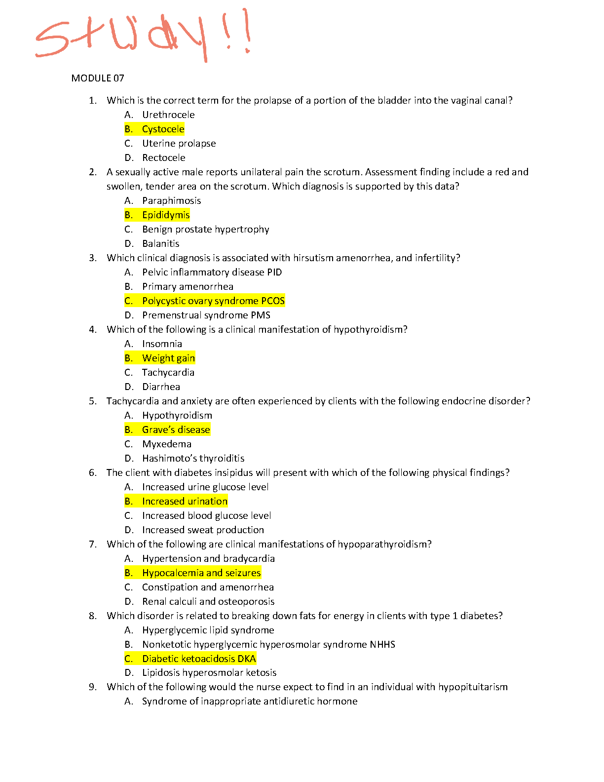 Master the complexities of the endocrine and reproductive systems with our latest 2025/2026 test bank for Module 07. This comprehensive study resource is packed with detailed questions and verified answers covering key topics such as PCOS, Diabetic Ketoacidosis (DKA), Grave's Disease, Hypothyroidism, and Cystocele. Expertly designed to enhance your clinical reasoning and knowledge, this guide is your ultimate tool to help you pass your exams confidently on the first try, eliminating the need for resits. Perfect for nursing students aiming for top grades in advanced pathophysiology.
