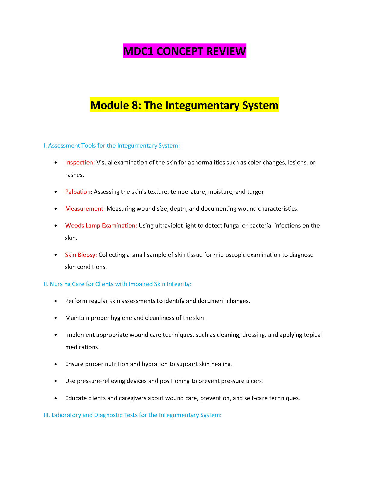 Ace your MDC1 course with our expertly crafted Concept Review for Module 8: The Integumentary System. This updated 2025/2026 study guide provides a detailed breakdown of all critical concepts you need to know. Master essential nursing skills, from assessment tools (Inspection, Palpation, Woods Lamp) to comprehensive nursing care for clients with impaired skin integrity. This essential resource is designed to help you study smarter, not harder, ensuring you pass your exams on the very first try. Don't risk a resit—get the ultimate study companion for the Integumentary System today!
