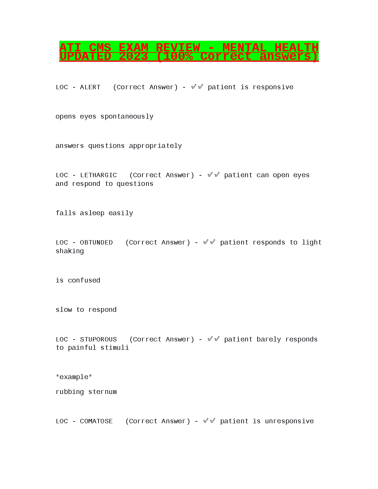 Master the ATI CMS Mental Health exam with our updated 2023 Test Bank. This essential study guide features a comprehensive collection of exam questions paired with 100% accurate and verified answers, designed to help you pass with confidence on your first attempt. Dive deep into critical nursing topics, such as assessing Levels of Consciousness (LOC), and gain the knowledge needed to excel. Prepare smarter, not harder, and secure the grade you deserve with this ultimate exam review resource from ATI.