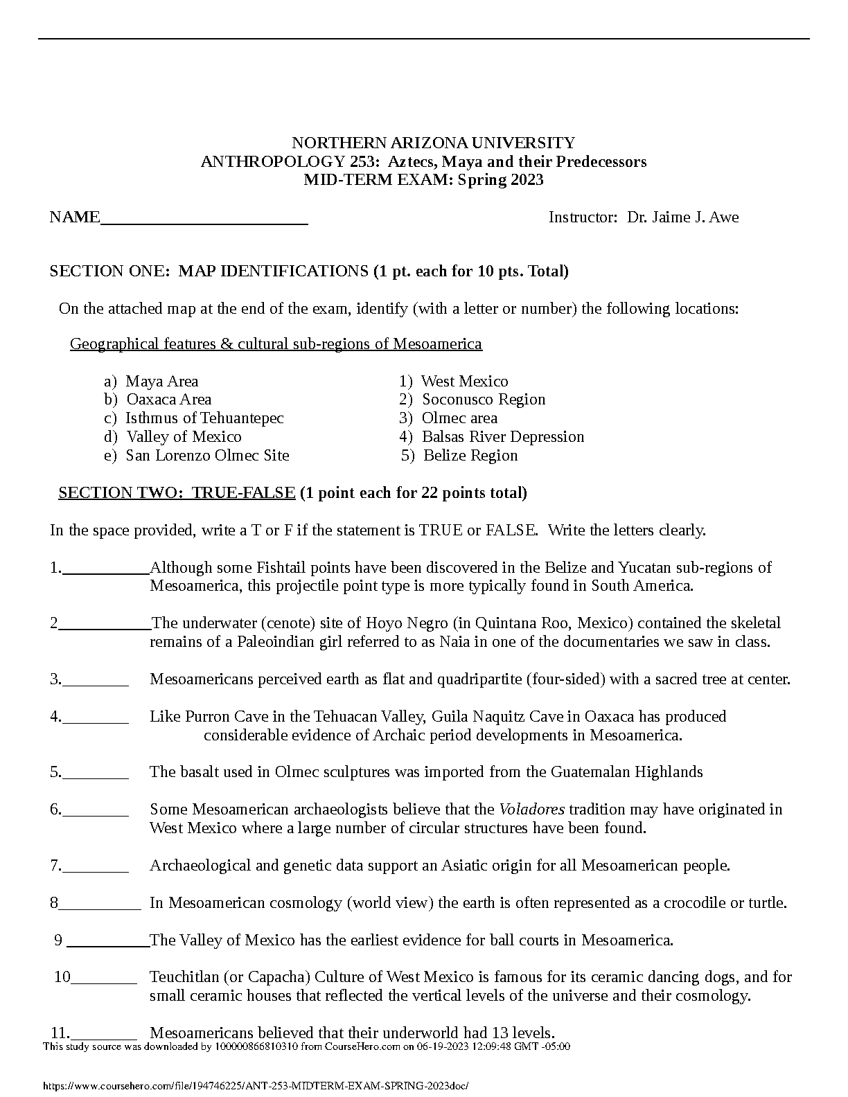Get ahead in your Anthropology 253 course with this comprehensive mid-term exam from the Spring 2023 semester at Northern Arizona University, prepared by renowned archaeologist Dr. Jaime J. Awe. This invaluable study resource, updated for the 2025/2026 academic year, provides a direct look at the types of questions you'll face. Master key topics including Mesoamerican geography, the Olmec and Maya civilizations, archaeological findings, and cultural cosmology. This practice exam covers map identifications and detailed true/false questions, designed to test your core knowledge and ensure you're fully prepared to pass your exams on the first attempt and avoid costly resits. Download now for a proven path to success in 'Aztecs, Maya and their Predecessors'.
