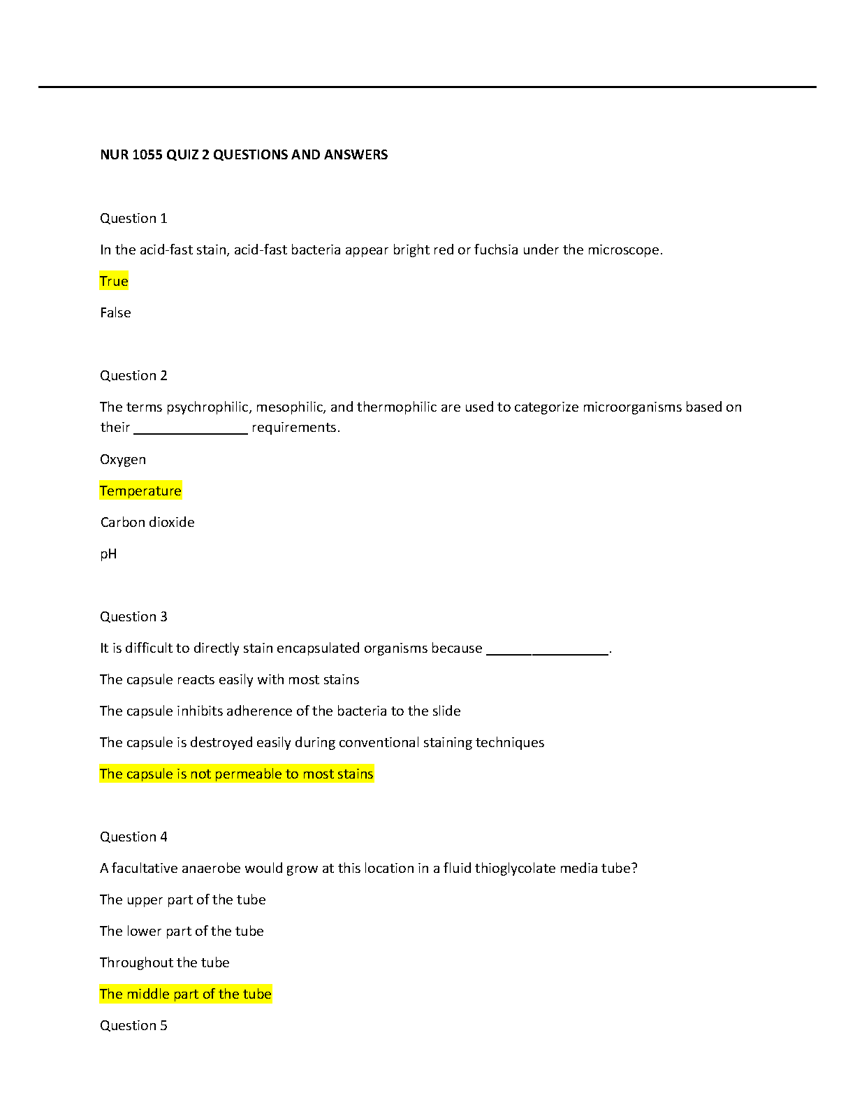 Unlock success in your NUR 1055 course with this detailed test bank for Quiz 2. This resource provides a complete set of questions along with 100% correct, verified answers. It covers essential microbiology topics including acid-fast staining, temperature requirements for microorganisms (psychrophilic, mesophilic, thermophilic), staining encapsulated organisms, and facultative anaerobe growth. This is the perfect study guide to help you master the material, prepare effectively for your exam, and achieve a top grade in your nursing studies.