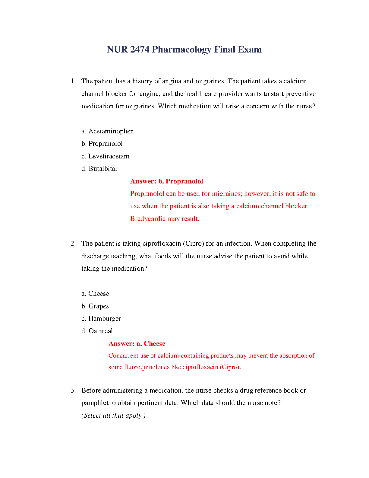 Unlock success in your NUR 2474 Pharmacology course with our definitive Final Exam Test Bank. This essential study tool provides a complete collection of exam-style questions, each meticulously paired with a correct answer and an in-depth, expert-written rationale. Deepen your understanding of critical topics like drug-drug interactions, patient discharge teaching, and safe medication administration. Our test bank is specifically designed to help you ace your final exam, build confidence, and master the core principles of nursing pharmacology.