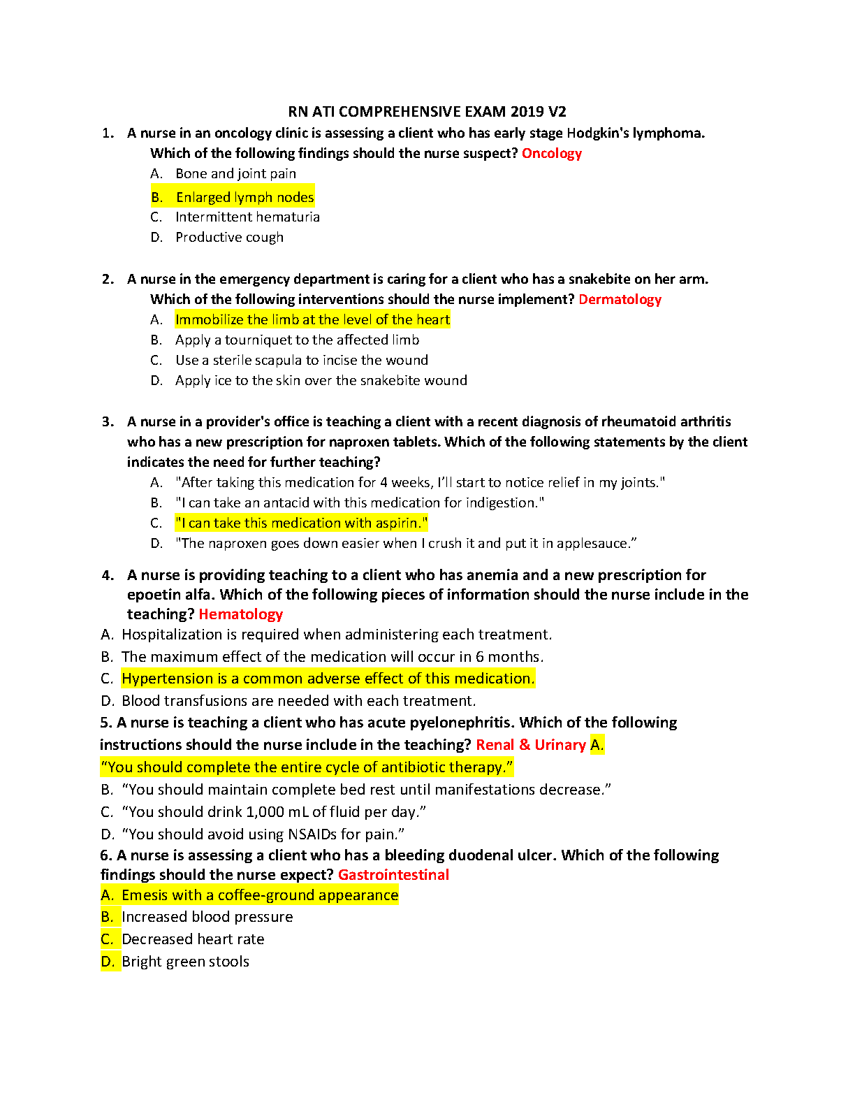Gain the ultimate advantage for your nursing career with the complete RN ATI Comprehensive Predictor Exam 2019 V2 test bank. This essential study resource provides a full set of verified questions, each with the correct answer clearly highlighted, covering critical nursing topics such as Oncology, Dermatology, Hematology, Renal & Urinary, and Gastrointestinal care. Designed to mirror the actual exam format, this guide is your key to mastering the material, boosting your confidence, and ensuring you pass the ATI Comprehensive Exam on your very first attempt. Updated for the 2025/2026 academic year, this is the perfect tool for nursing students aiming for success.