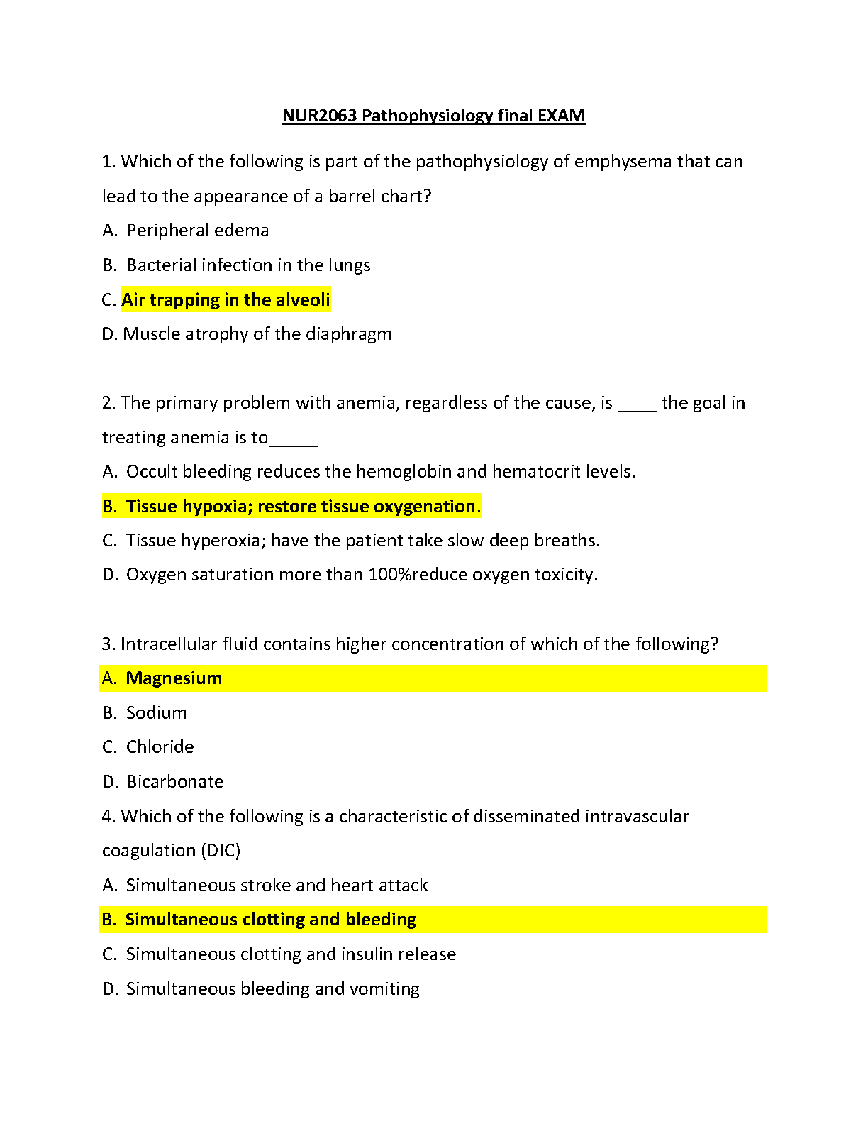 Ace your NUR2063 Pathophysiology final exam with this comprehensive test bank! This essential study resource provides a complete set of multiple-choice questions, each with a verified correct answer, mirroring the format and difficulty of the actual exam. Dive deep into crucial topics such as the pathophysiology of emphysema, anemia, intracellular fluid balance, and disseminated intravascular coagulation (DIC). Designed specifically for nursing students aiming for success, this guide is your key to mastering complex concepts, boosting your confidence, and passing your final exam on the first try. Get the A-grade you deserve!