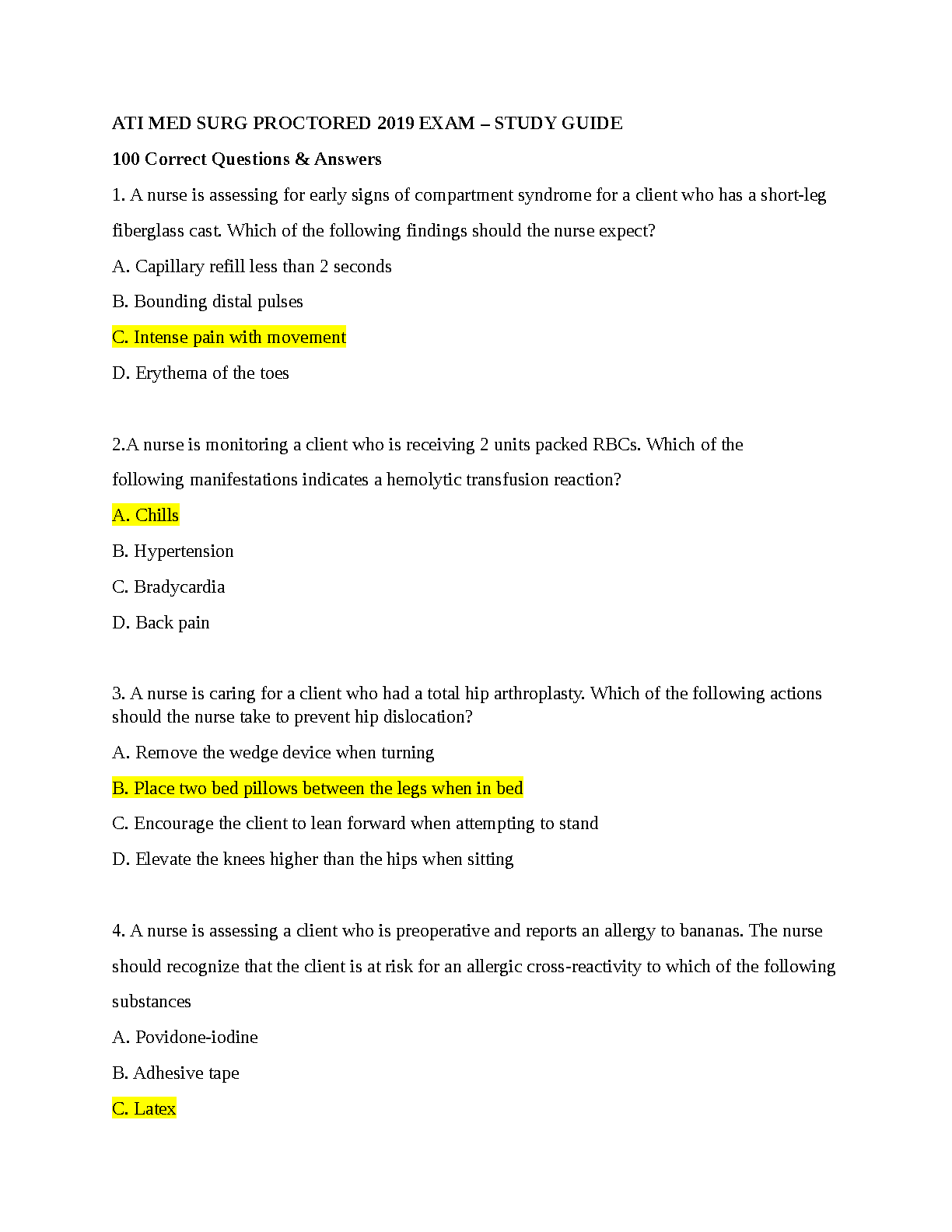 ATI Med Surg Proctored Exam 2019 Test Bank | Complete Study Guide with 100 Correct Questions & Answers