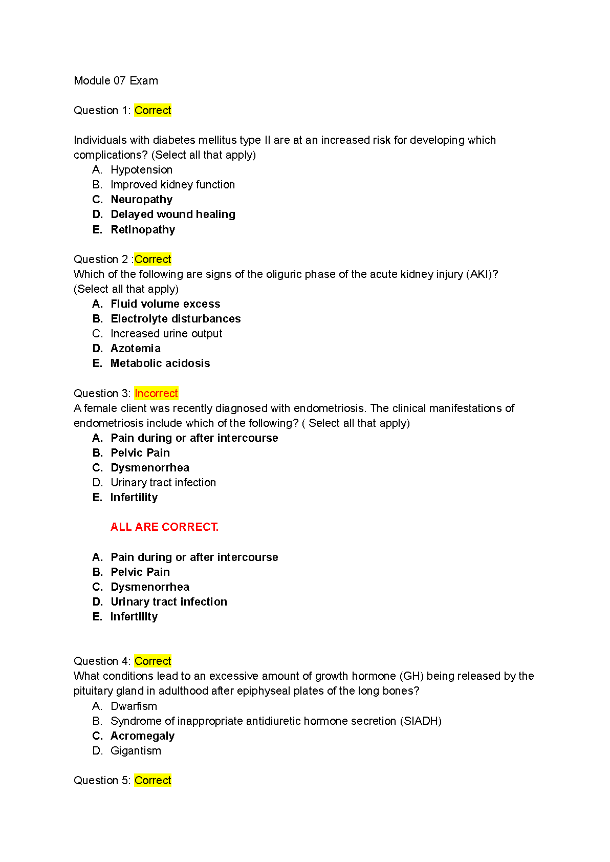 Ace your upcoming medical-surgical and pathophysiology exams with this comprehensive test bank for Module 07. This study guide features a curated set of exam-style questions complete with 100% correct and verified answers. Deepen your understanding of critical topics including the long-term complications of Type II Diabetes, the signs of acute kidney injury (AKI), clinical manifestations of endometriosis, and endocrine system disorders like acromegaly. This is the ultimate resource to help you study smarter, build confidence, and pass your exam on the first try.