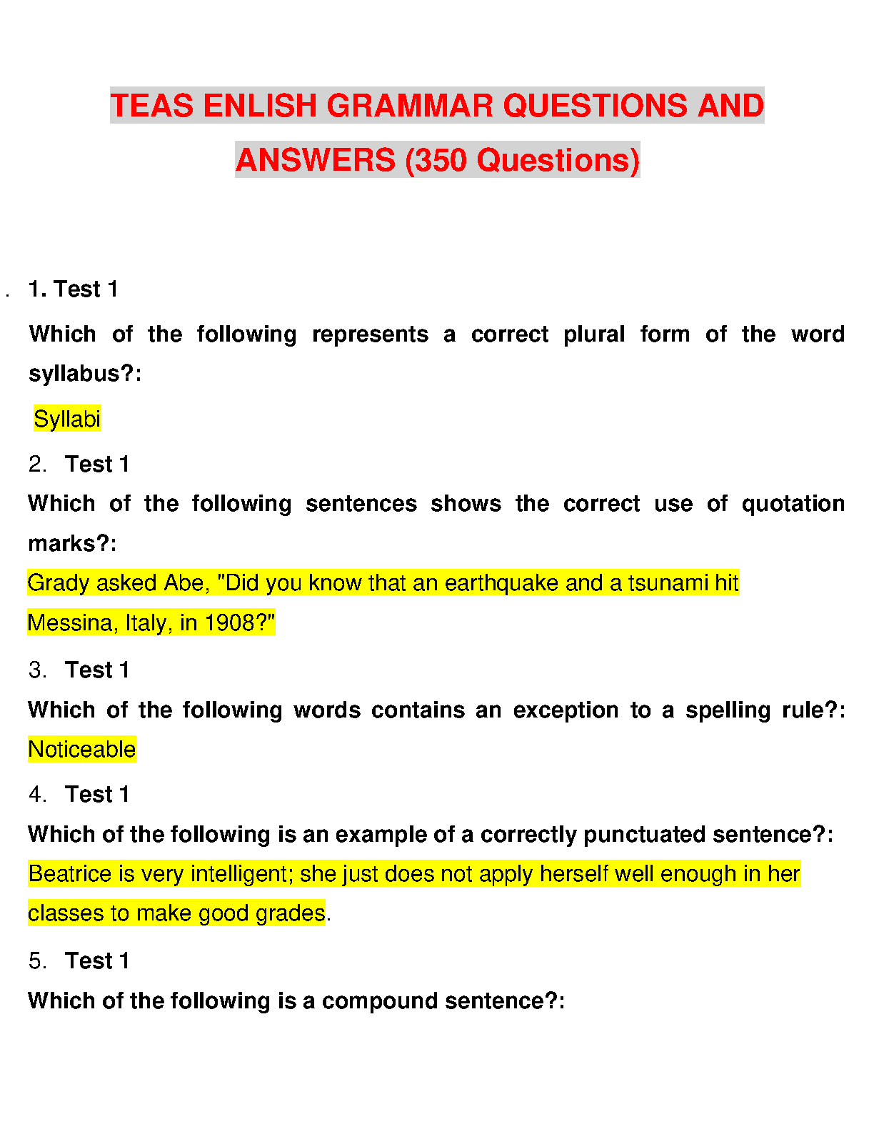 Unlock your potential and ace the ATI TEAS 7 English and Language Usage section with our comprehensive 2025/2026 test bank. This digital resource features over 350 meticulously crafted practice questions, each with a verified answer, covering all essential grammar, punctuation, and spelling concepts you'll encounter on the real exam. Designed to help you study efficiently and avoid resits, this guide is your key to mastering the material and passing on your first attempt. Get instant access to the practice you need for a top score!
