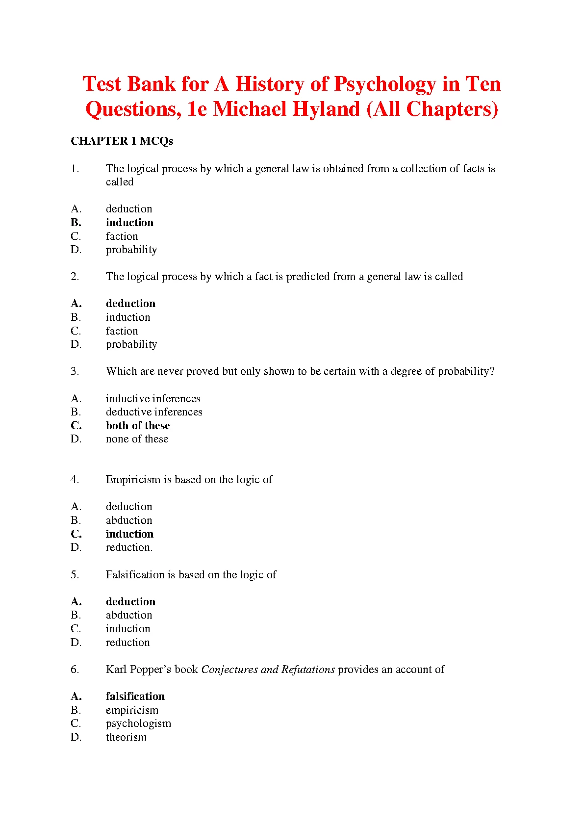 Test Bank for A History of Psychology in Ten Questions, 1ST EDITION BY Michael Hyland