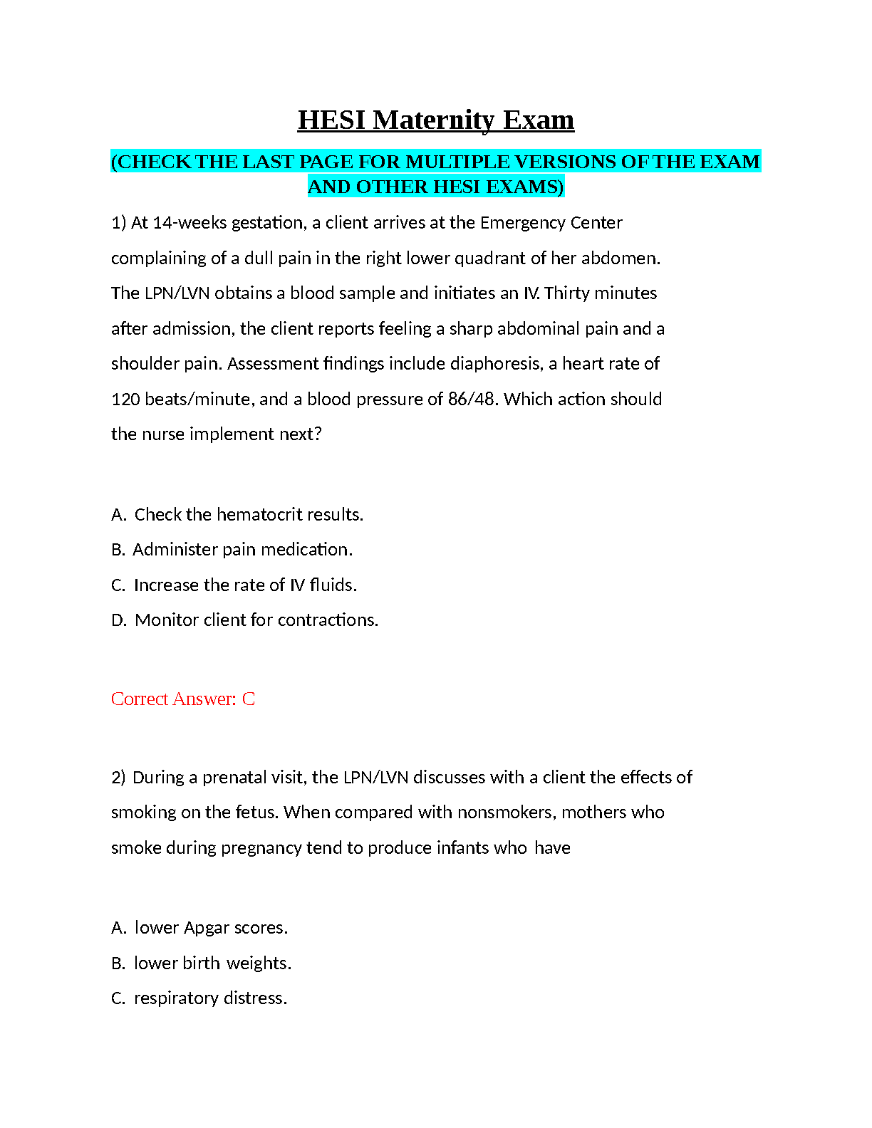 HESI Maternity Nursing Exam Test Bank 2025/2026: A+ Guide with Questions & Correct Answers to Pass on Your First Try