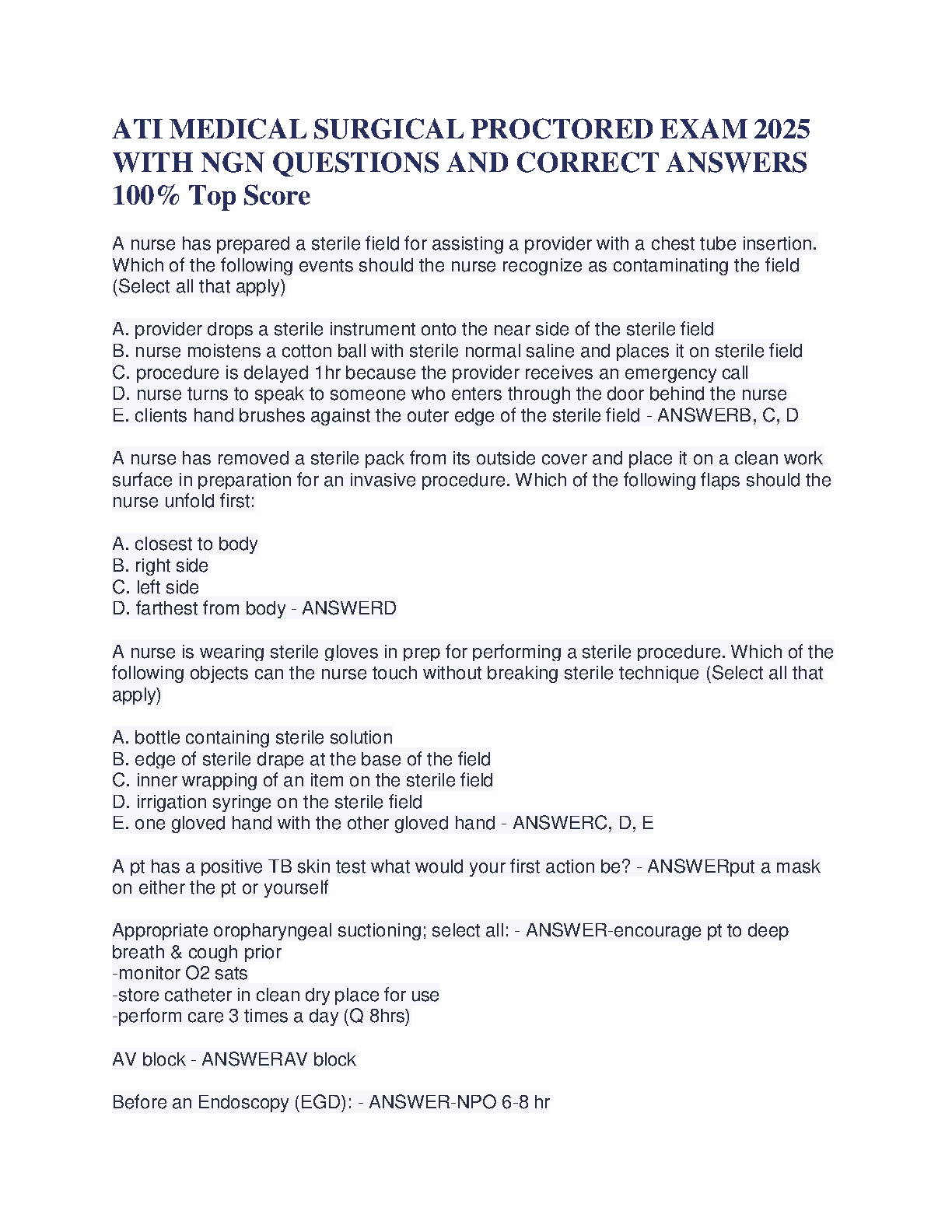 Are you a nursing student aiming for a top score on your ATI Medical Surgical Proctored Exam? This comprehensive study guide for the 2025/2026 academic year is your key to success. It features a curated collection of the latest NGN-style questions, complete with detailed, verified answers. This resource is specifically designed to help you master critical concepts, build exam-taking confidence, and ensure you pass on your very first attempt. Stop worrying about resits and start preparing effectively with this essential guide to achieve the top score you deserve!