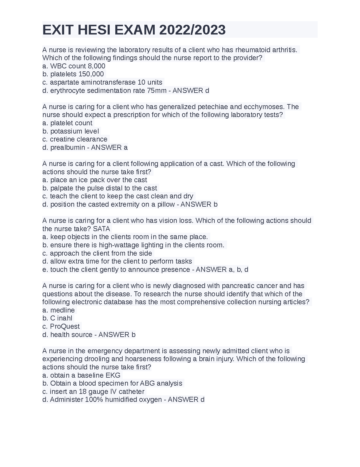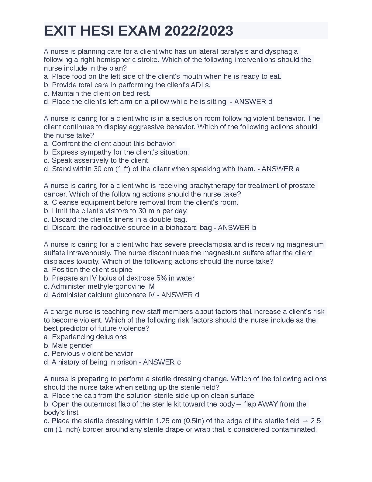 Ace your nursing program finals with the complete HESI Exit Exam 2022/2023 Test Bank. This essential resource is filled with verified questions and detailed answers that reflect the latest curriculum for the 2025/2026 academic year. Master complex clinical scenarios, strengthen your knowledge, and build the confidence needed to pass your HESI Exit exam on the very first try. This guide is your ultimate tool to avoid resits and confidently advance toward your NCLEX and nursing career.