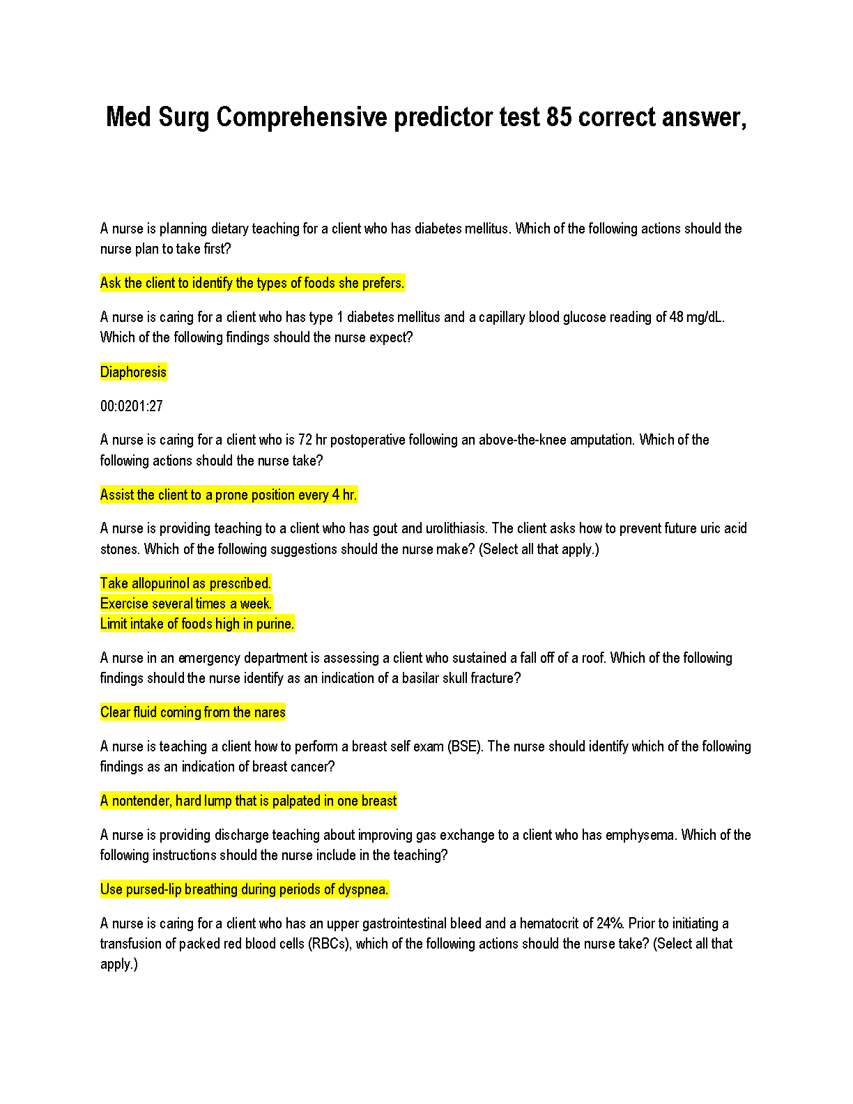 Ace your nursing exams with this comprehensive test bank for the ATI Med-Surg Comprehensive Predictor. This study guide features 85 practice questions, each with its verified correct answer, covering a wide range of essential Med-Surg topics. Prepare for scenarios involving diabetes mellitus, post-operative care, gout management, critical head injuries, patient teaching for breast self-exams, and respiratory conditions. This resource is perfectly designed to help you master key concepts, test your knowledge, and build confidence for your exams and future NCLEX success. Get the practice you need to pass on your first attempt!