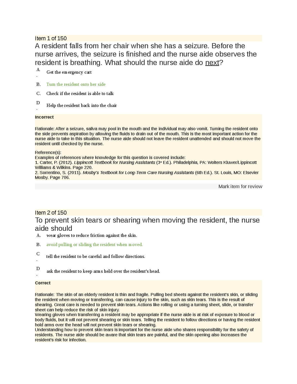 Achieve success in your nursing assistant program with this complete test bank for Mosby's Textbook for Long-Term Care Nursing Assistants, 6th Edition. This essential study tool features 150 multiple-choice questions, each with a comprehensive rationale to clarify the correct answer and deepen your understanding of key concepts. Covering vital topics like patient safety, post-seizure care, and proper patient handling to prevent injuries like skin tears, this resource is perfectly designed to help you master the material. Prepare effectively for your exams, build confidence, and pass your course with this indispensable collection of practice questions.