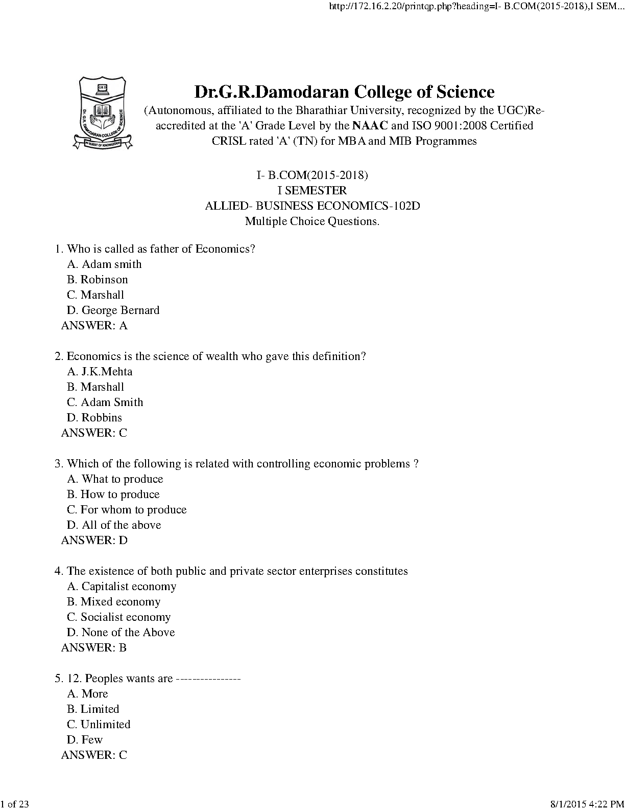 Business Economics Test Bank: Comprehensive MCQs with Verified Answers for B.COM Students