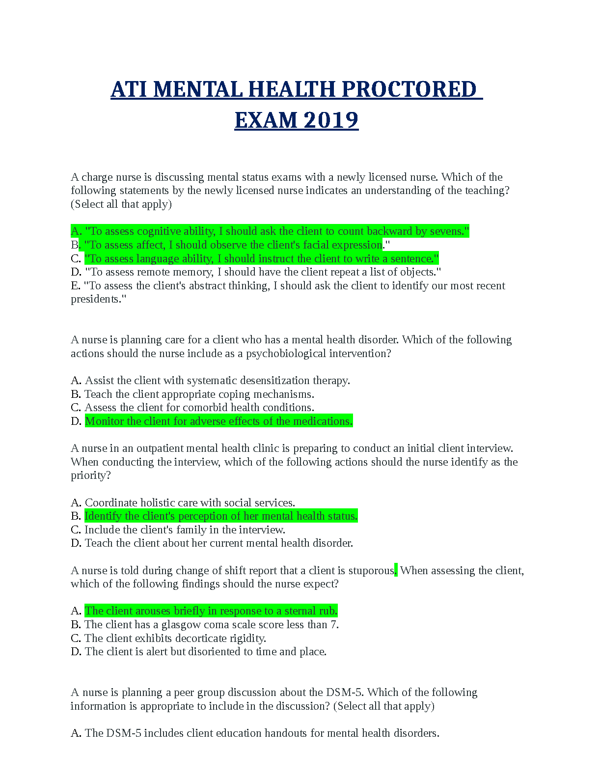 Ace your nursing exams with confidence using our latest 2025/2026 ATI Mental Health Proctored Exam Test Bank. This comprehensive study guide, developed by the Assessment Technologies Institute (ATI), is packed with authentic questions and detailed answers from recent exams, including the 2019 version. It's meticulously designed to help you master critical concepts in psychiatric nursing, understand the exam format, and eliminate test-day anxiety. Stop worrying about resits—this is the ultimate resource to help you pass the ATI Mental Health Proctored Exam on your very first try and advance in your nursing program.