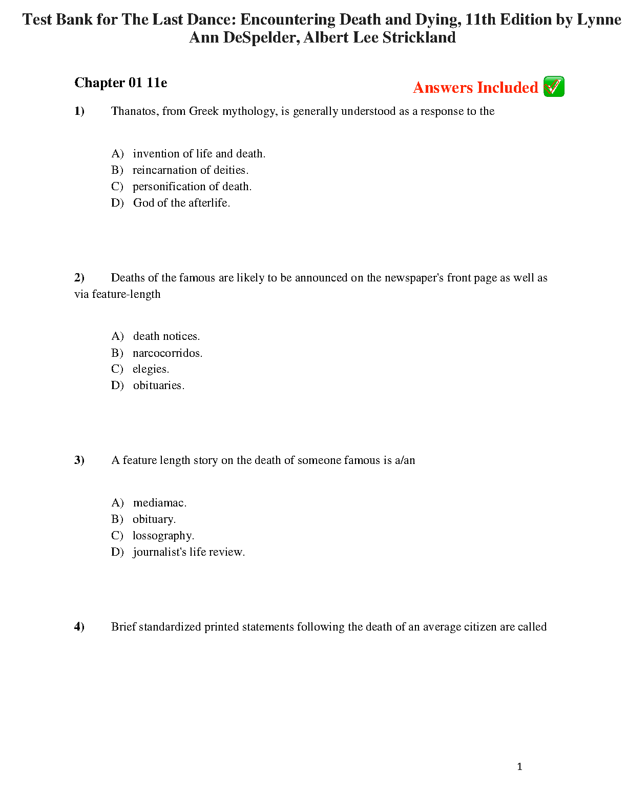 Instantly download the official Test Bank for 'The Last Dance: Encountering Death and Dying,' 11th Edition by Lynne Ann DeSpelder and Albert Lee Strickland. This is the ultimate resource to help you pass your exams on the first attempt. Featuring a comprehensive collection of questions and verified answers for every chapter, this test bank allows you to master key concepts in thanatology, practice with exam-style questions, and confidently prepare for your assessments. Don't just study—strategize for success with this essential tool. (Note: This is the test bank, not the textbook).